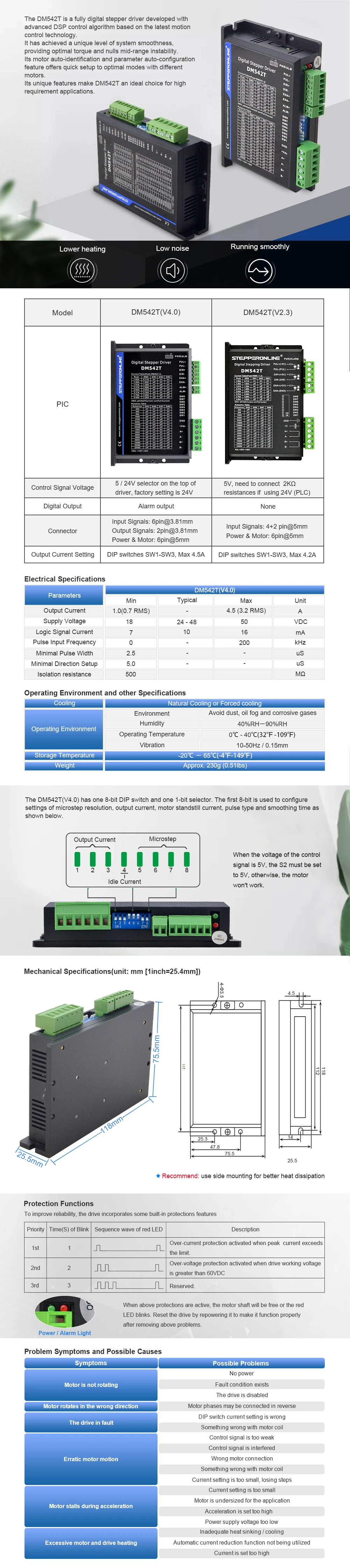 Драйвер шагового двигателя STEPPERONLINE DM542T, 2-фазный цифровой контроллер шагового двигателя, 1,0-4,2 А, 20-50 В постоянного тока, для Nema 1723