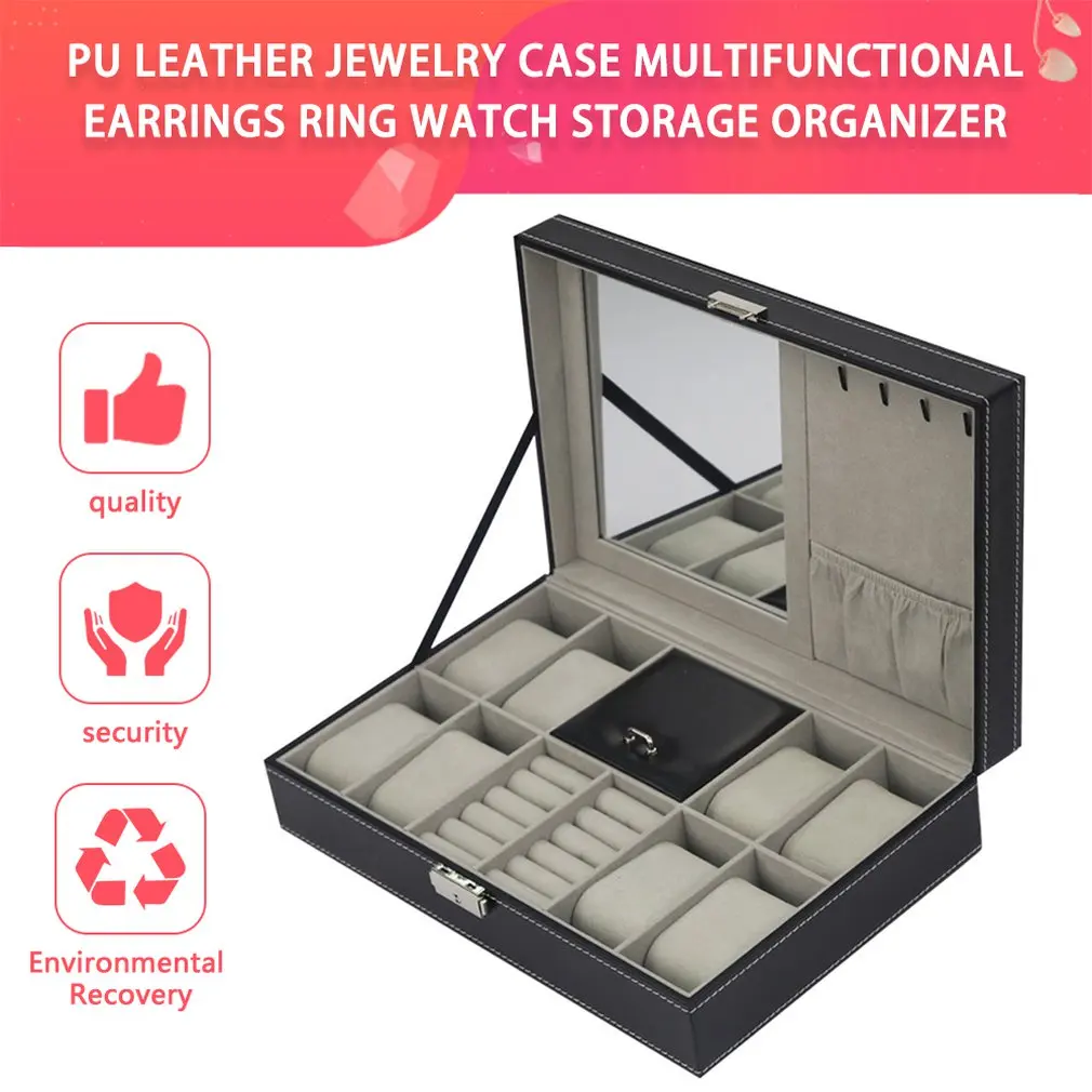 Особенности:Изготовлен из роскошной синтетической кожи, он износостойкий и прочный.Лучше всего для демонстрации ваших часов в магазине или на туалетном столике.Съемные подушечки внутри для организации часов, идеально подходят для ваших потребностей.С большим зеркалом в крышке для легкого макияжа и одевания.Идеально подходит для личного или делового использования.Описание:Мягкая подкладка внутри защитит любимое украшение от царапин и повреждений.Достаточно большой размер для ваших ожерелий, браслетов, часов, серег, сережек-гвоздиков и других косметических средств.С металлическим замком для сохранения всех ваших украшений в безопасности.Хорошо подходит для украшения домашних ювелирных изделий.Посылка входит:1 x коробка для часовПримечания:1. Из-за различий между различными мониторами изображение может не отражать фактический цвет изделия. Мы гарантируем, что модель реального изделия не отличается от представленной на фото.2. Из-за ручного измерения и различных методов измерения, пожалуйста, учитывайте погрешность в 1-3 см. Спасибо!