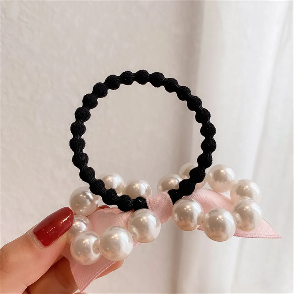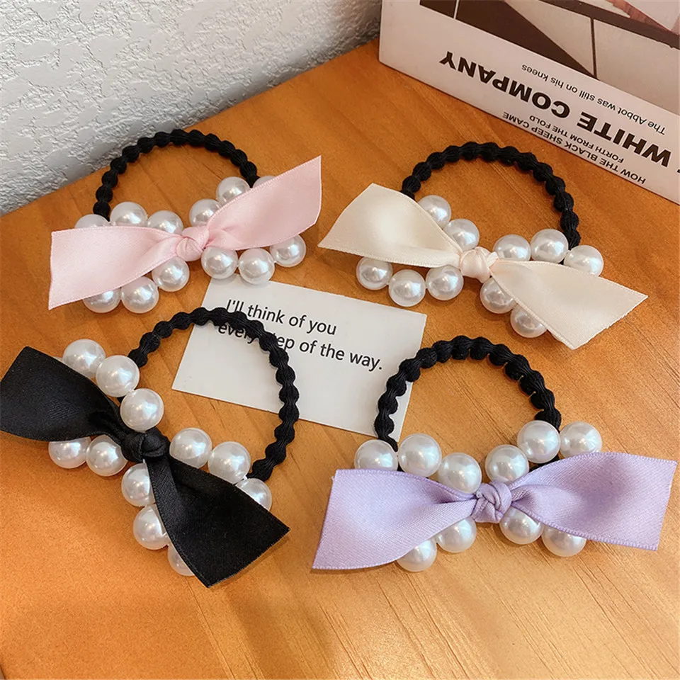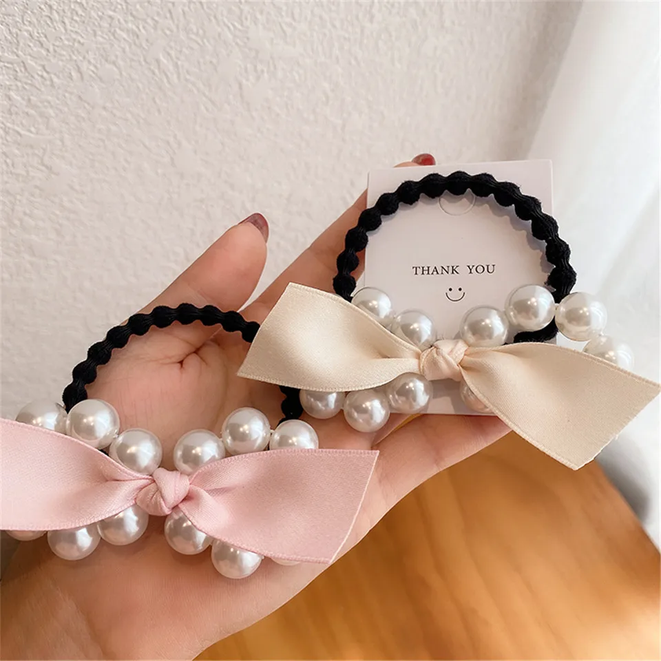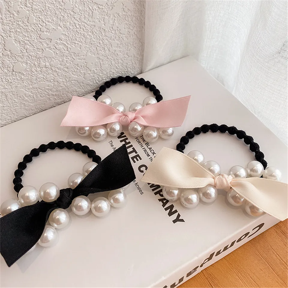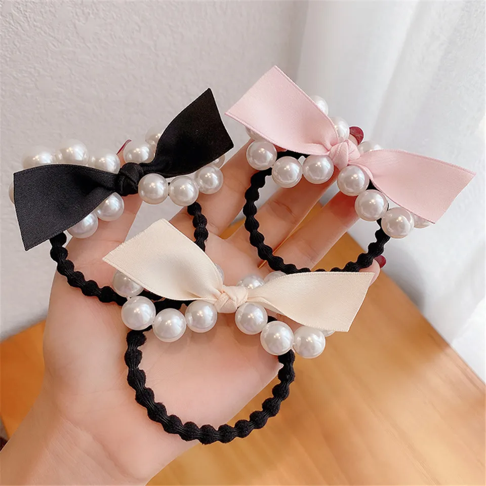 Корейский Стиль для женщин и девочек с жемчужинами и перфорированным бантом резинка для волос, обтянутая тканью; Веревки резинкой c элегантной лентой модный конский Хвостик Держатель женские аксессуары для волос