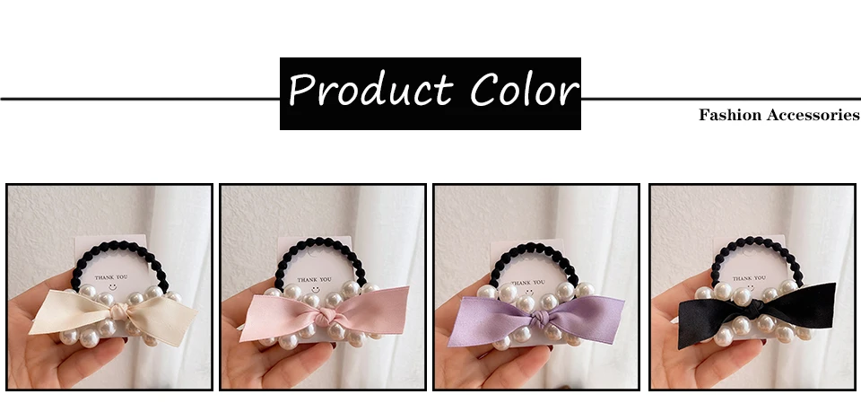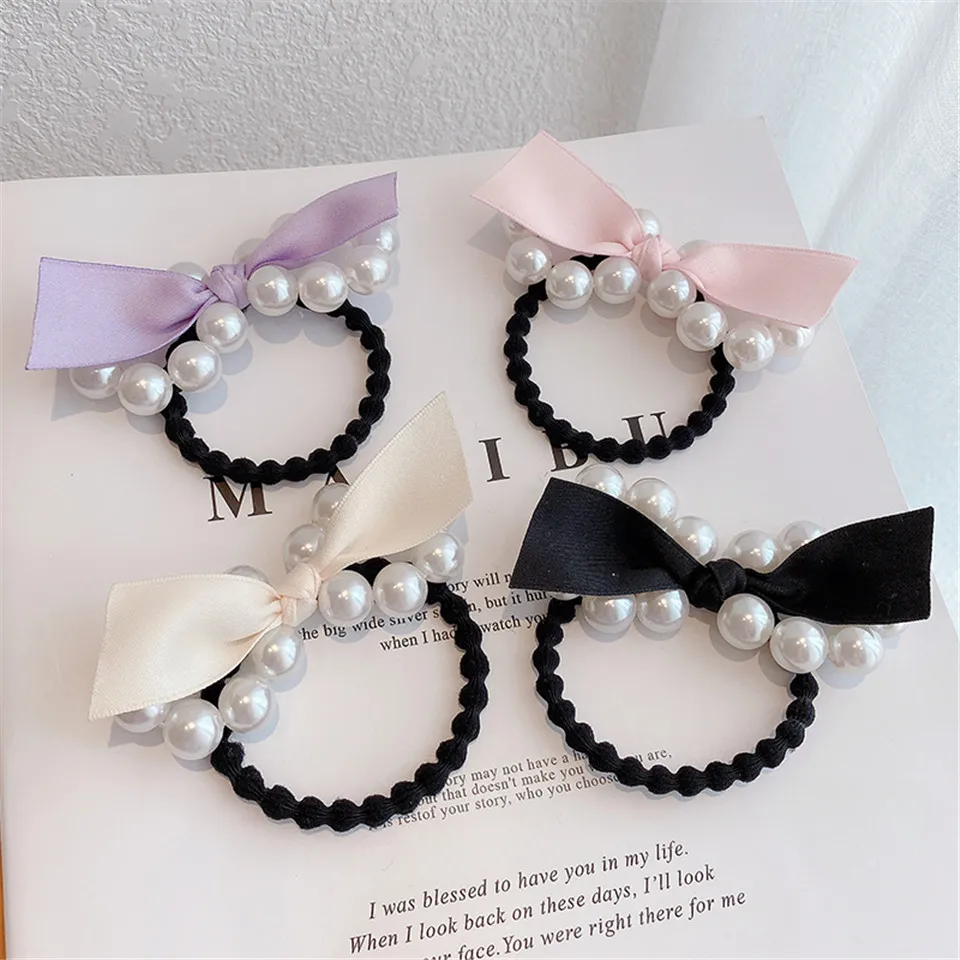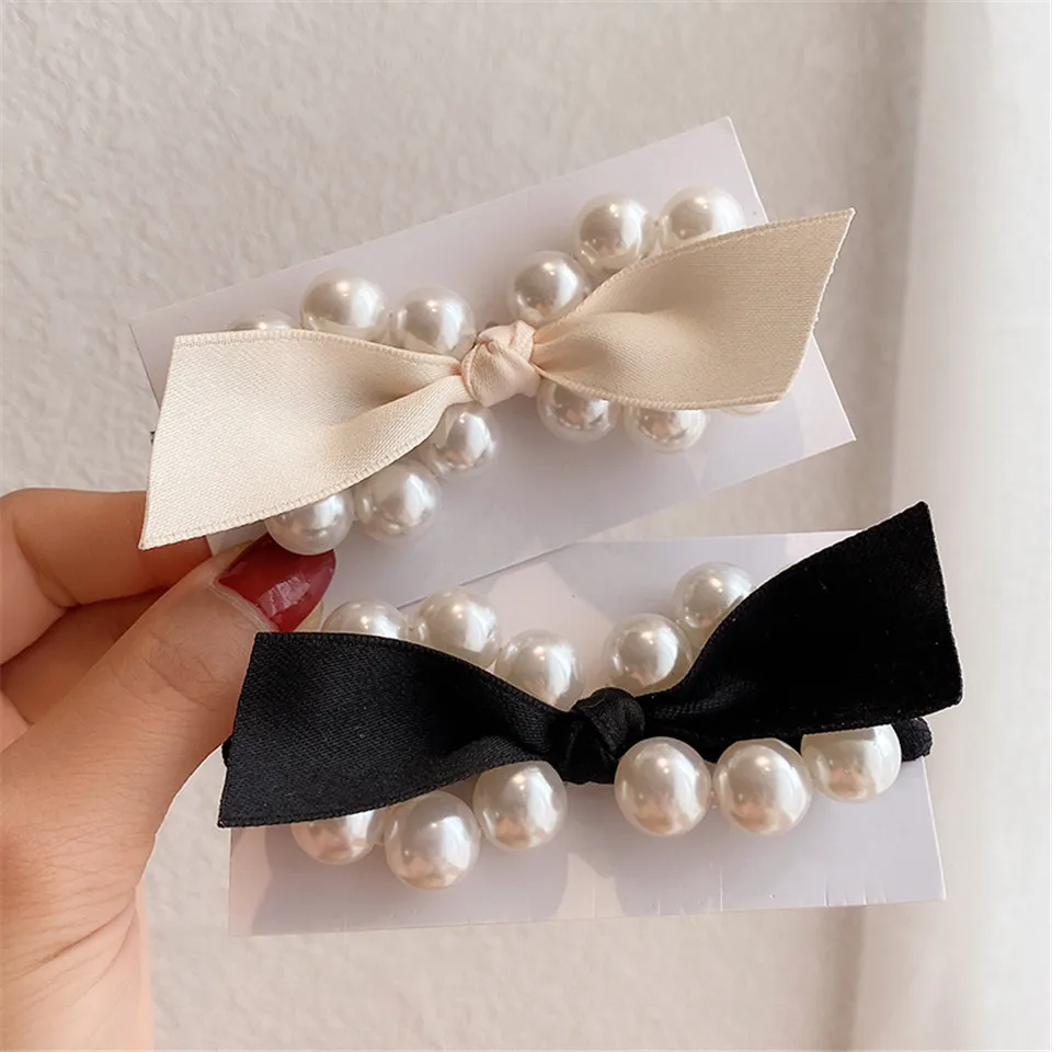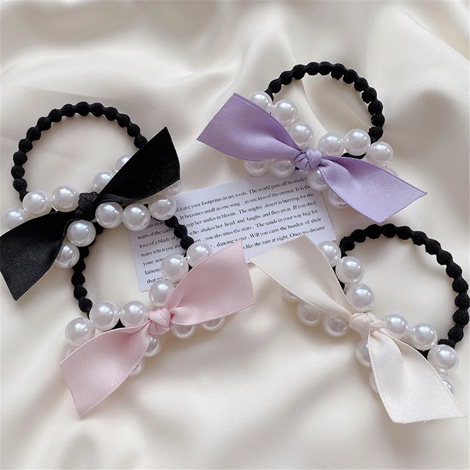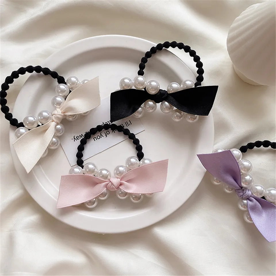 Корейский Стиль для женщин и девочек с жемчужинами и перфорированным бантом резинка для волос, обтянутая тканью; Веревки резинкой c элегантной лентой модный конский Хвостик Держатель женские аксессуары для волос