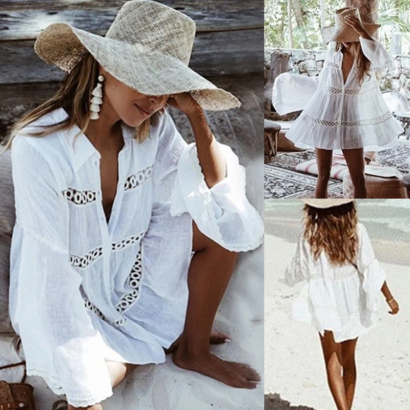 Женский кружевной вязаный крючком однотонный пляжный накидка сексуа...