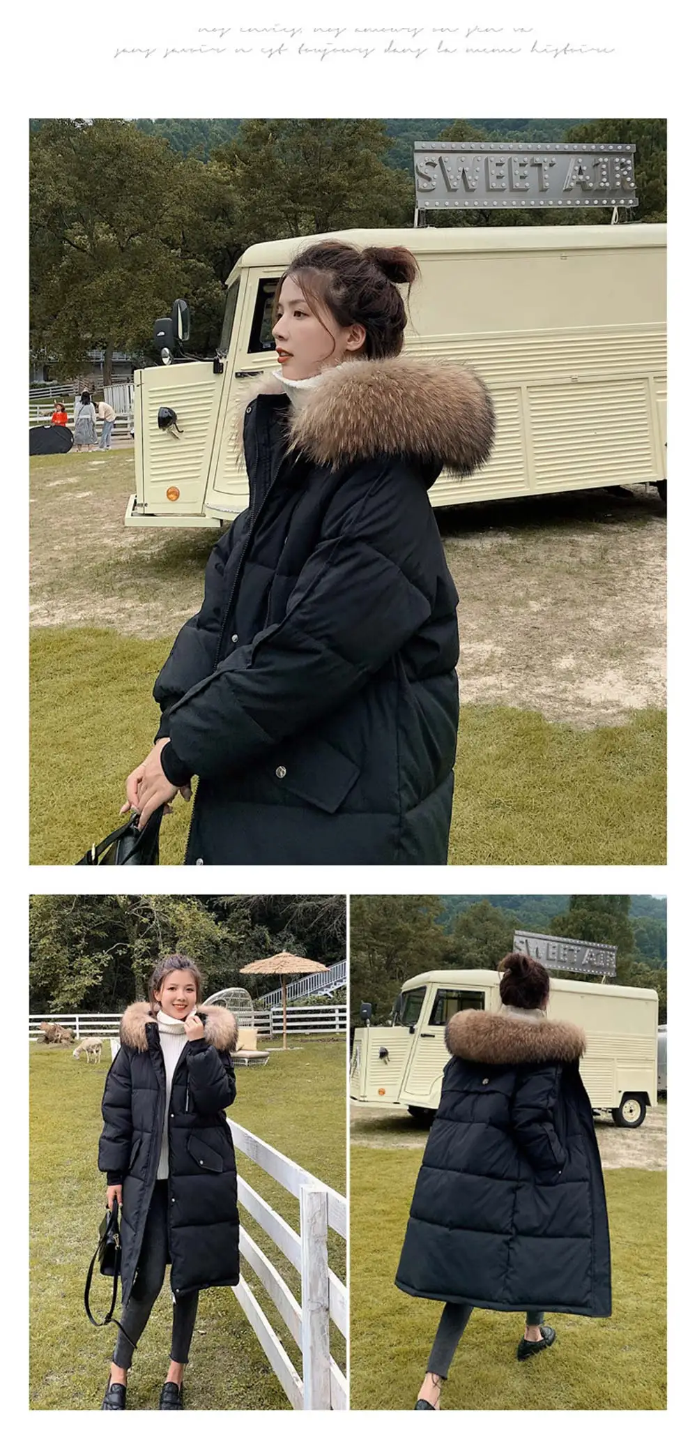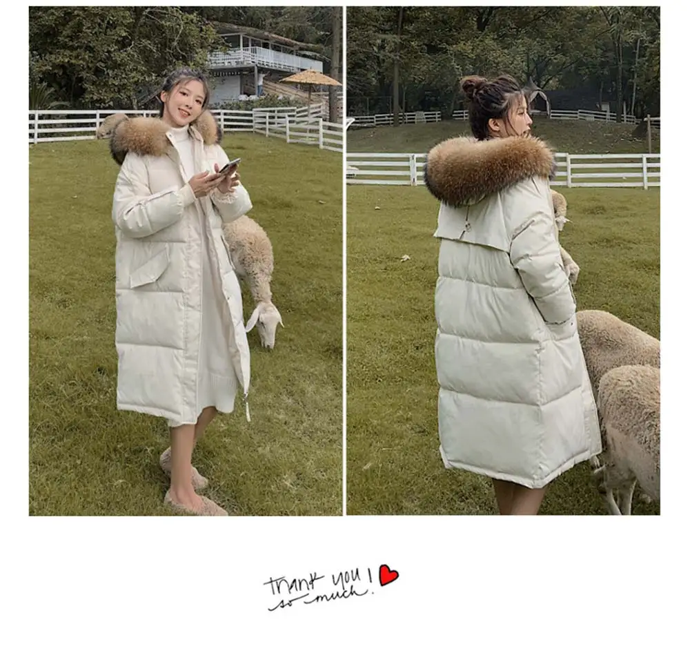 Длинное зимнее пальто, женская пуховая парка с капюшоном, Новая женская теплая зимняя куртка, женская Свободная куртка с большим меховым воротником, пальто
