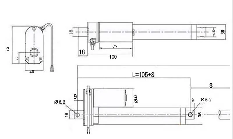 Параметры изделия: 1. Напряжение привода: 12 В постоянного тока 2. Максимальная тяга: 150 кг/1500н 3. Минимальный размер установки (полностью убирается посередине расстояния между двумя отверстиями): L1 = Ход + 105 мм 4. Максимальный установочный размер (полностью выдвигается вокруг середины расстояния двух отверстий): L = 2xS (ход) + 105 мм 5. Температура окружающей среды: от-26 до + 65 градусов 6. Класс защиты: IP 54 7. Встроенные концевые выключатели (по завершении хода линейный привод автоматически останавливается!) 8. Низкий уровень шума, уровень шума ниже 42 дБ 9. Правило работы: 10%. Номинальная тяга загрузки требует 10% рабочей нормы. В 20 минут 2 минуты работы 18 минут отдыха. Если более низкая нагрузка может продлить время работы. 10. Максимальная сила самоблокировки 2300N