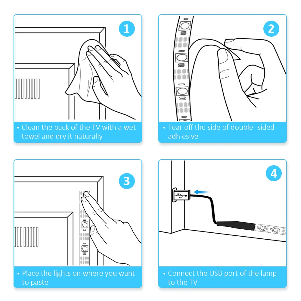 1. Сначала проверьте, работает ли продукт propelu2. Очистите и высушите место установки3 гибких соединительных шнура позволяют легко сгибаться в углу4 работает с usb-портом tv, зарядным устройством для телефона и зарядным устройством с выходом