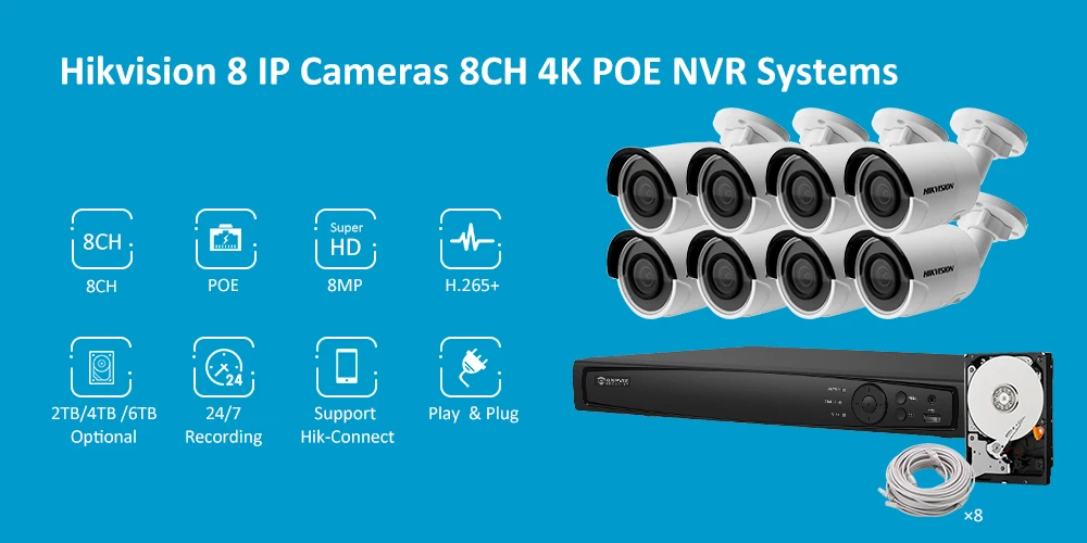 Hikvision, IP-камера безопасности, 4K, 8 каналов, POE, NVR, Hikvision, 8 МП