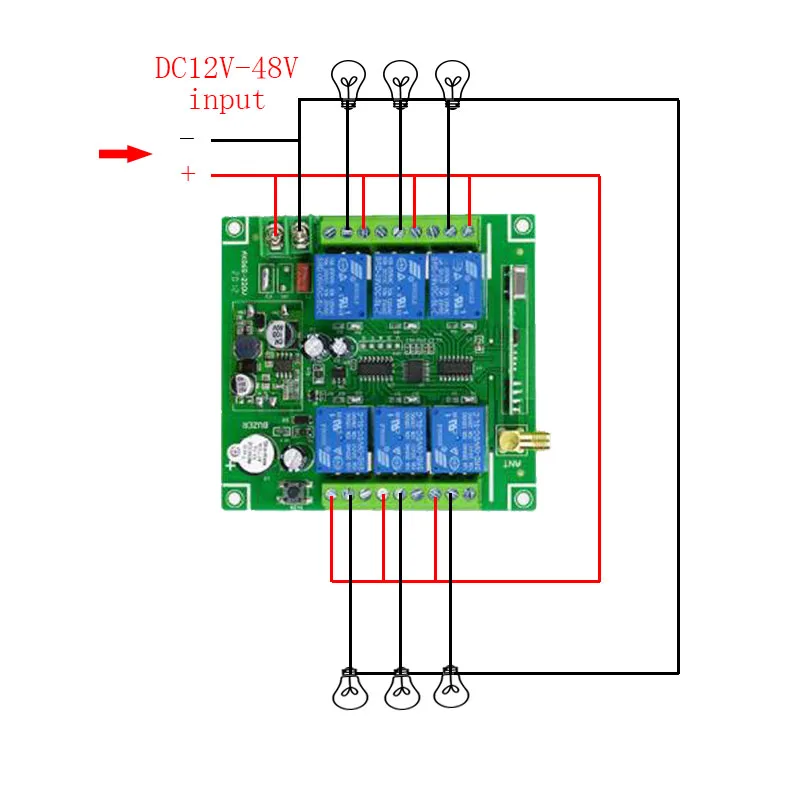 Переключение ---------------- нажмите кнопку передатчика 1 в течение 1 времени, реле приемника 1th включено, нажмите кнопку 1 снова, реле приемника 1th выключено, те же 2/3/4/5/6 являются независимыми.