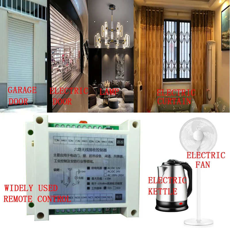 В основном используется в управлении гаражными дверями, управлении освещением, электрических дверях, занавесках с дистанционным управлением, подъемном оборудовании, управлении двигателем, водяном насосе, управлении проекционным экраном, охранной промышленности и других областях, легко устанавливается, используйте преимущества простой и безопасной и надежной.