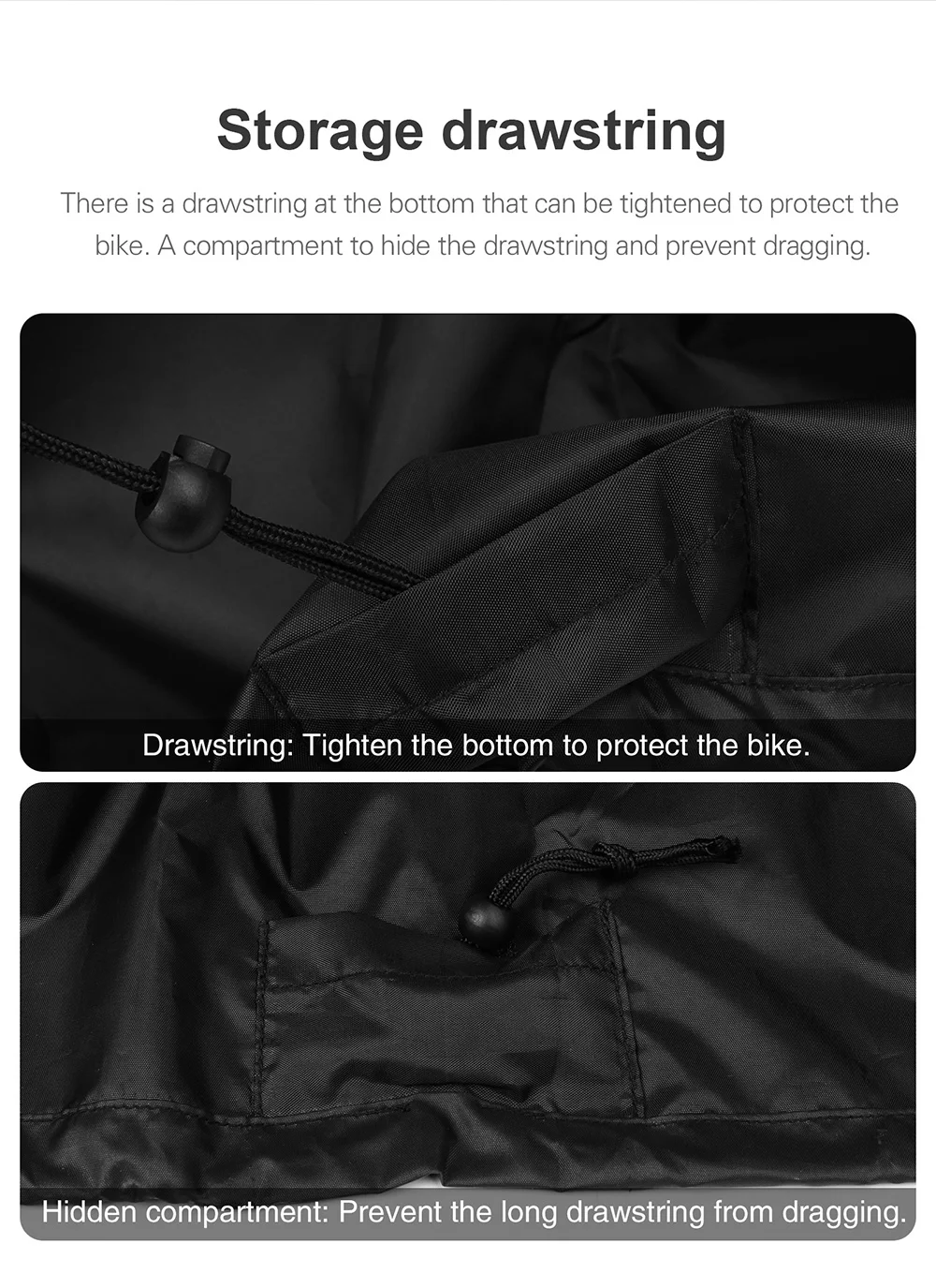 8. Шнурок для хранения; Есть шнурок в нижней части, который может быть затянут, чтобы защитить велосипед, отсек, чтобы скрыть шнурок и предотвратить перетаскивание.