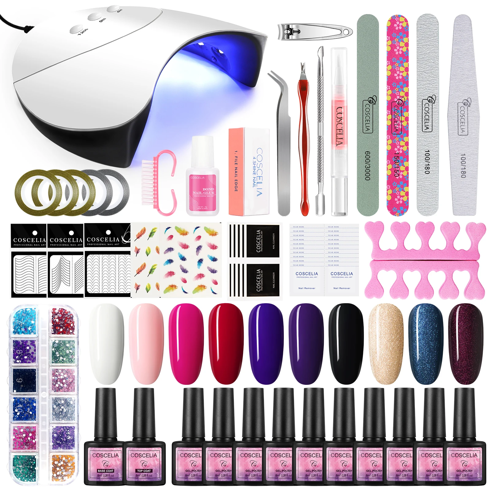 1x36W УФ светодиодный USB лампаВерхнее пальто COSCELIA-1 шт.Базовое пальто COSCELIA-1 шт.10/12 x Гель-лак для ногтей (цвет как на фото)1 x Губка для ногтей1 х черные пилочки для ногтей1 х желтая Кисть для макияжа1 х Масло для кутикулы2 x сепаратора для ногтей1 x вилка для кутикулы1 x Толкатель для кутикулы1 x кусачки для ногтей1 x ручка для ногтей10 x салфетки для удаления лака для ногтей10 x обертывания для очищения ногтей1 x Стразы для дизайна ногтей2 х наклейки для французского маникюра2 x наклейки для ногтей