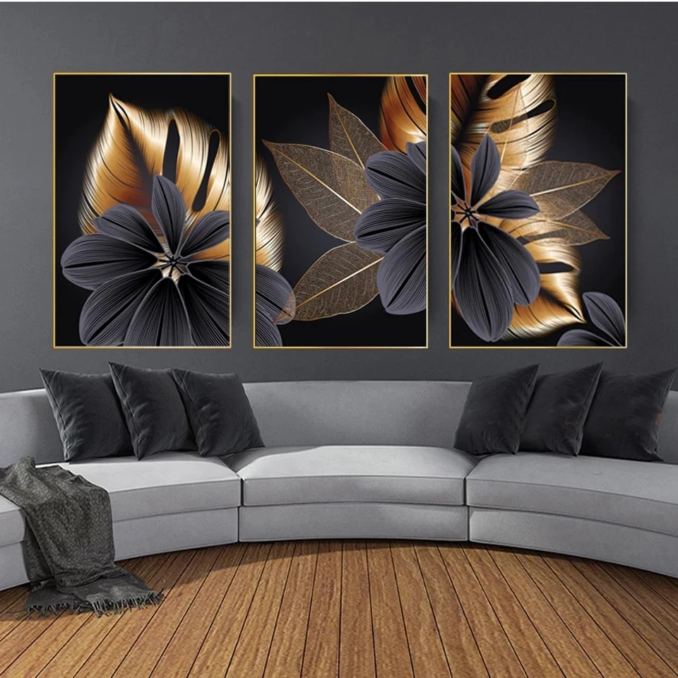 Триптих, Черное золото, листья растений, домашний декор, абстрактная картина на стену, алмазная живопись, нордическая картина для украшения гостиной