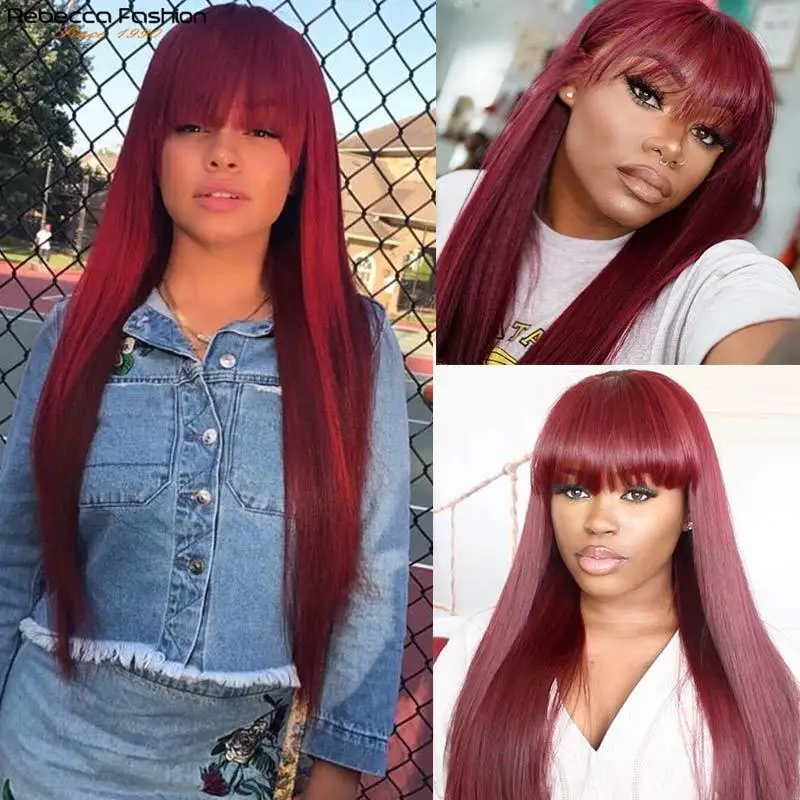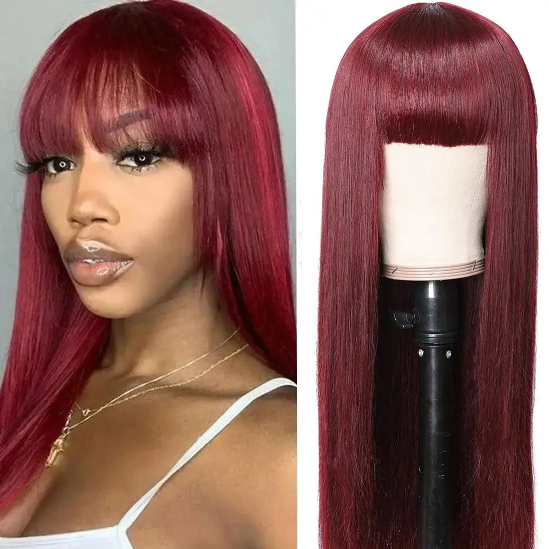 99Jбордовые красные человеческие волосы парики с челкой Бразильские...