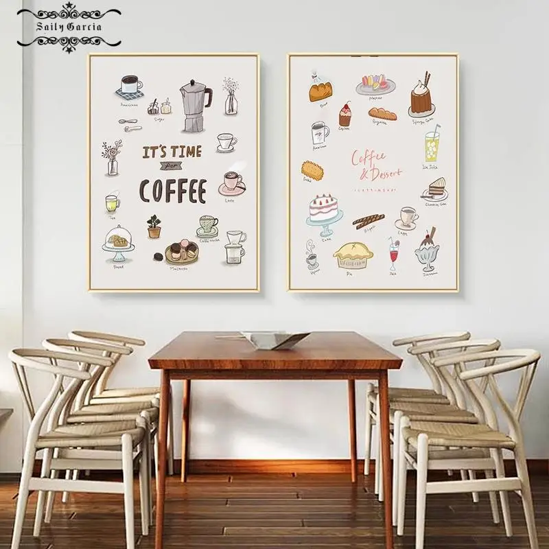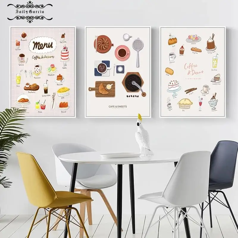 Мультяшный постер меню, Картина на холсте с изображением милой еды, кофе, десертов, выпечки, магазина, настенные картины для хлебобулочной кухни, украшение для дома