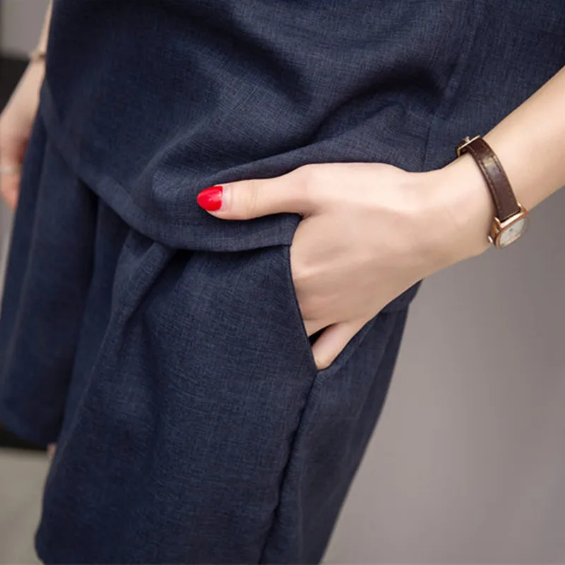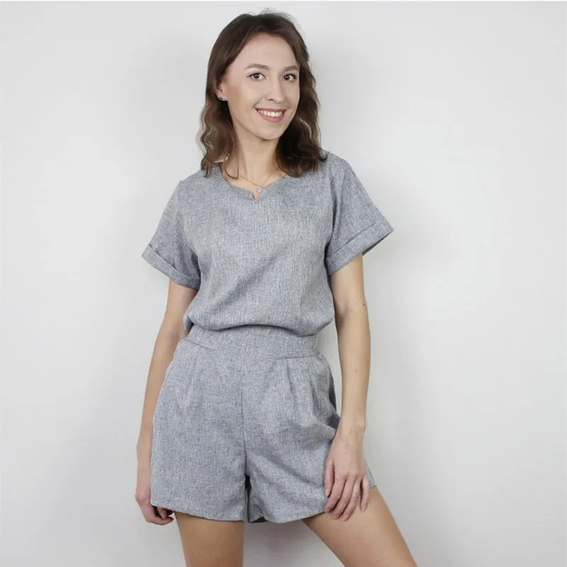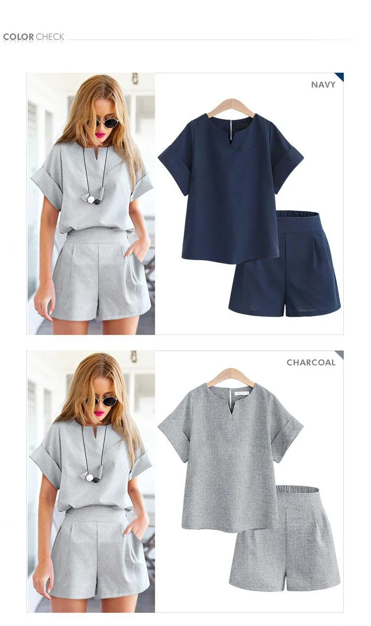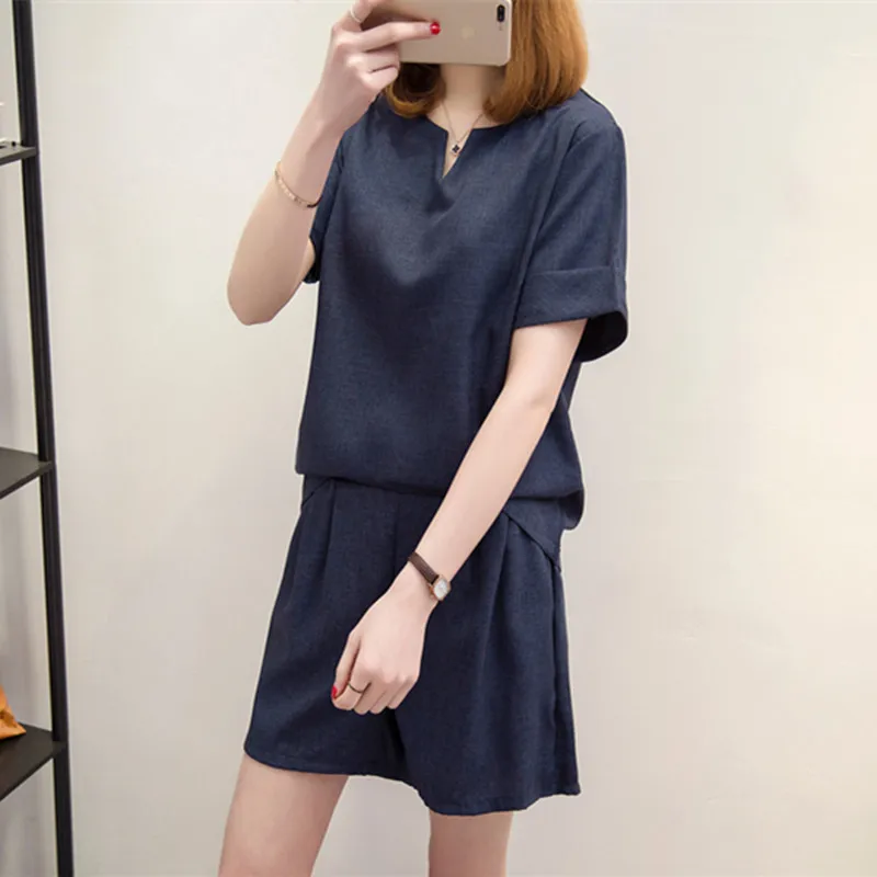 Женский спортивный костюм из двух предметов, однотонный пуловер с V-образным вырезом и коротким рукавом и шорты, хлопковый льняной костюм оверсайз для лета