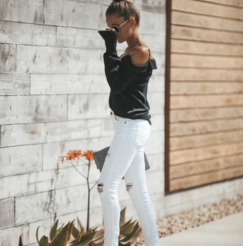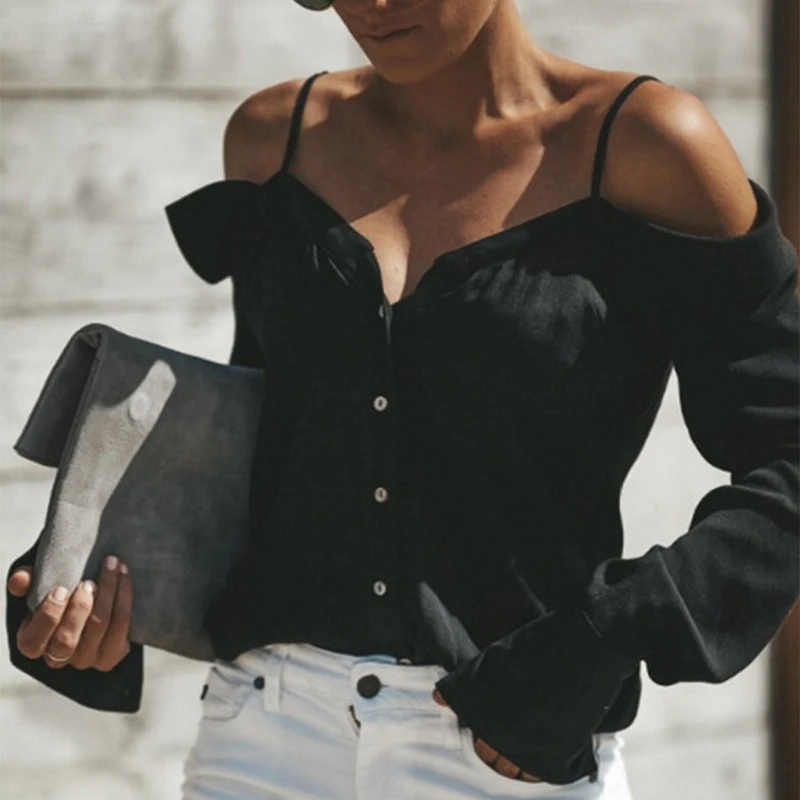 Женская шифоновая блузка, с открытыми плечами и V-образным вырезом, с длинным рукавом