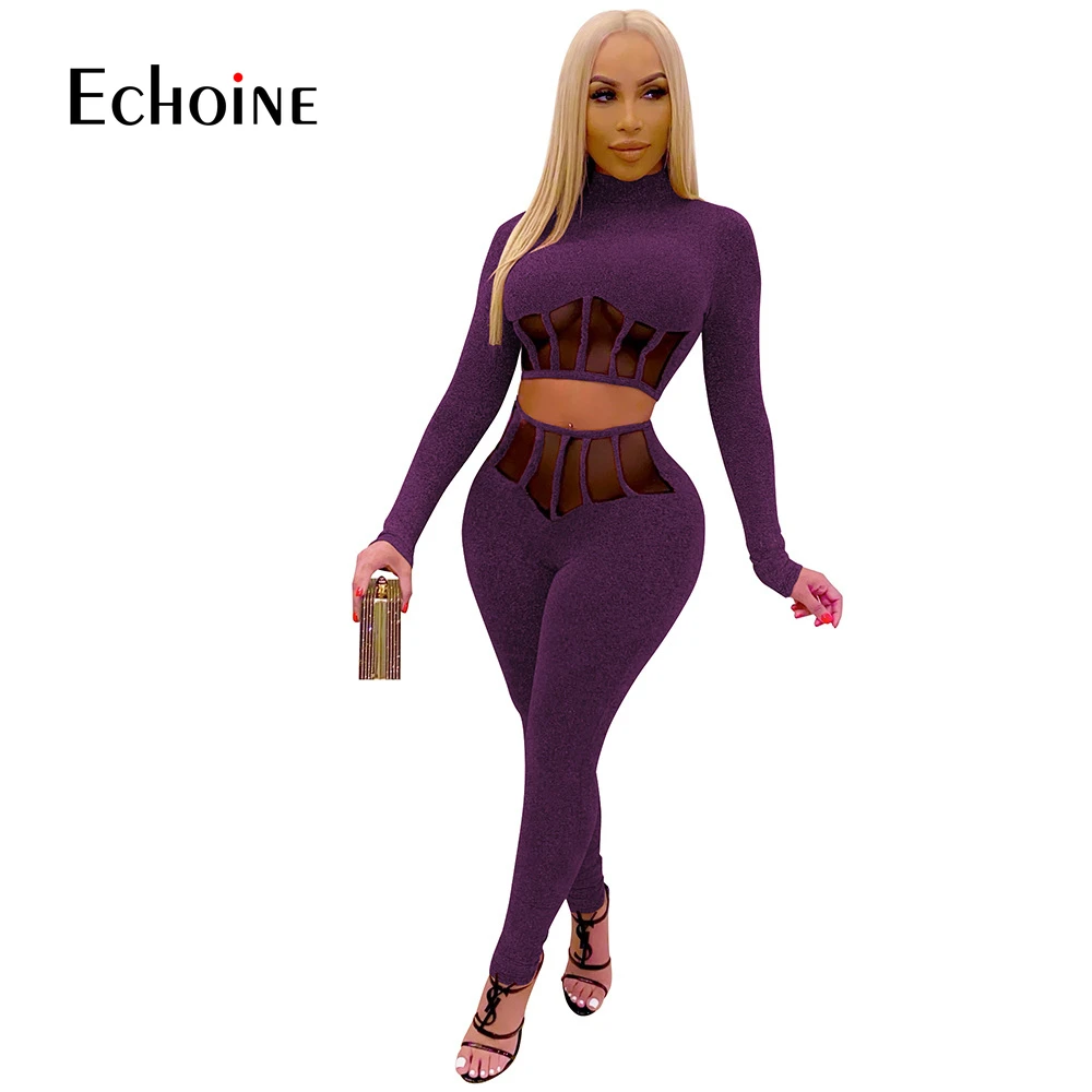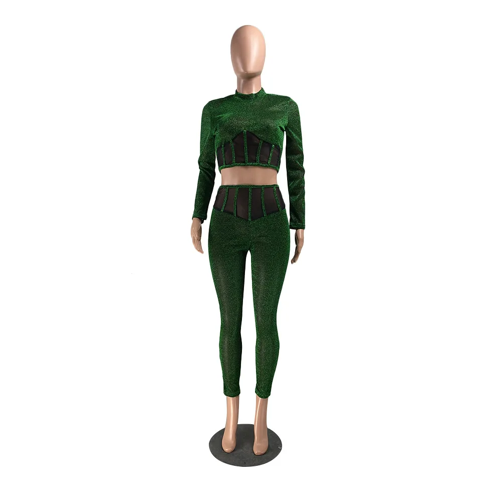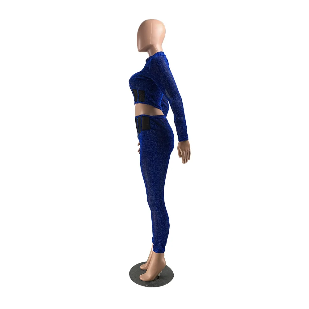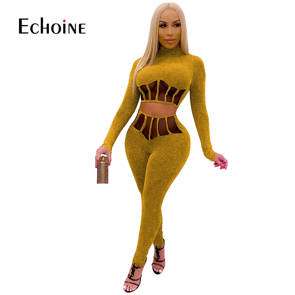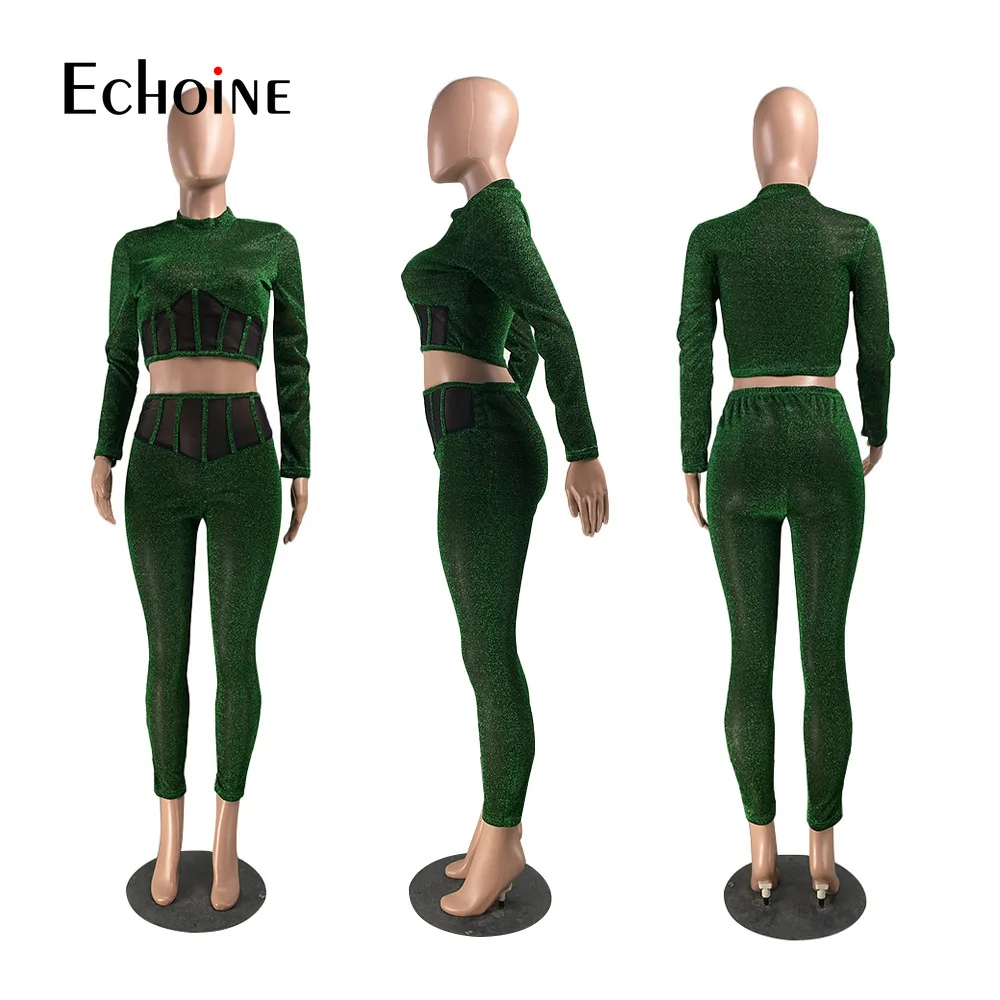 Женский сетчатый комплект из двух предметов, укороченный топ с длинными рукавами и обтягивающие брюки-карандаш