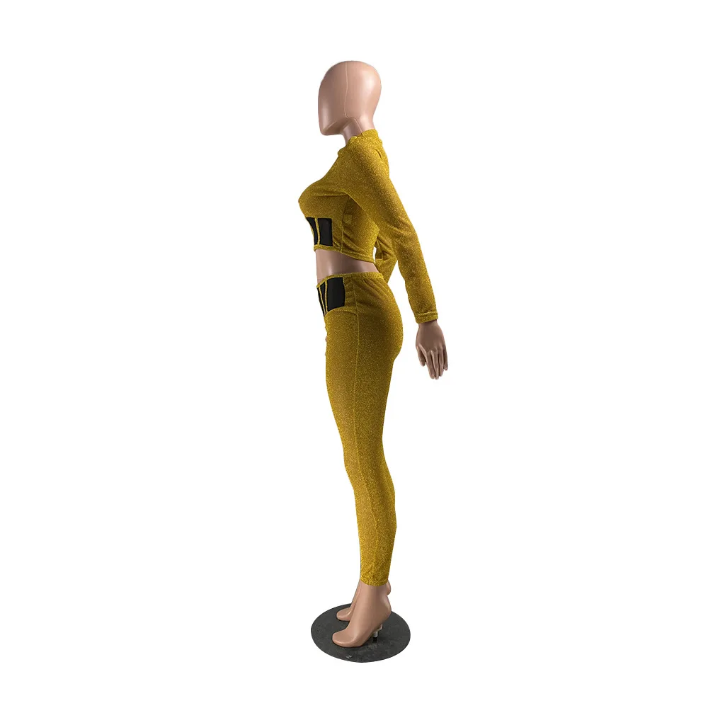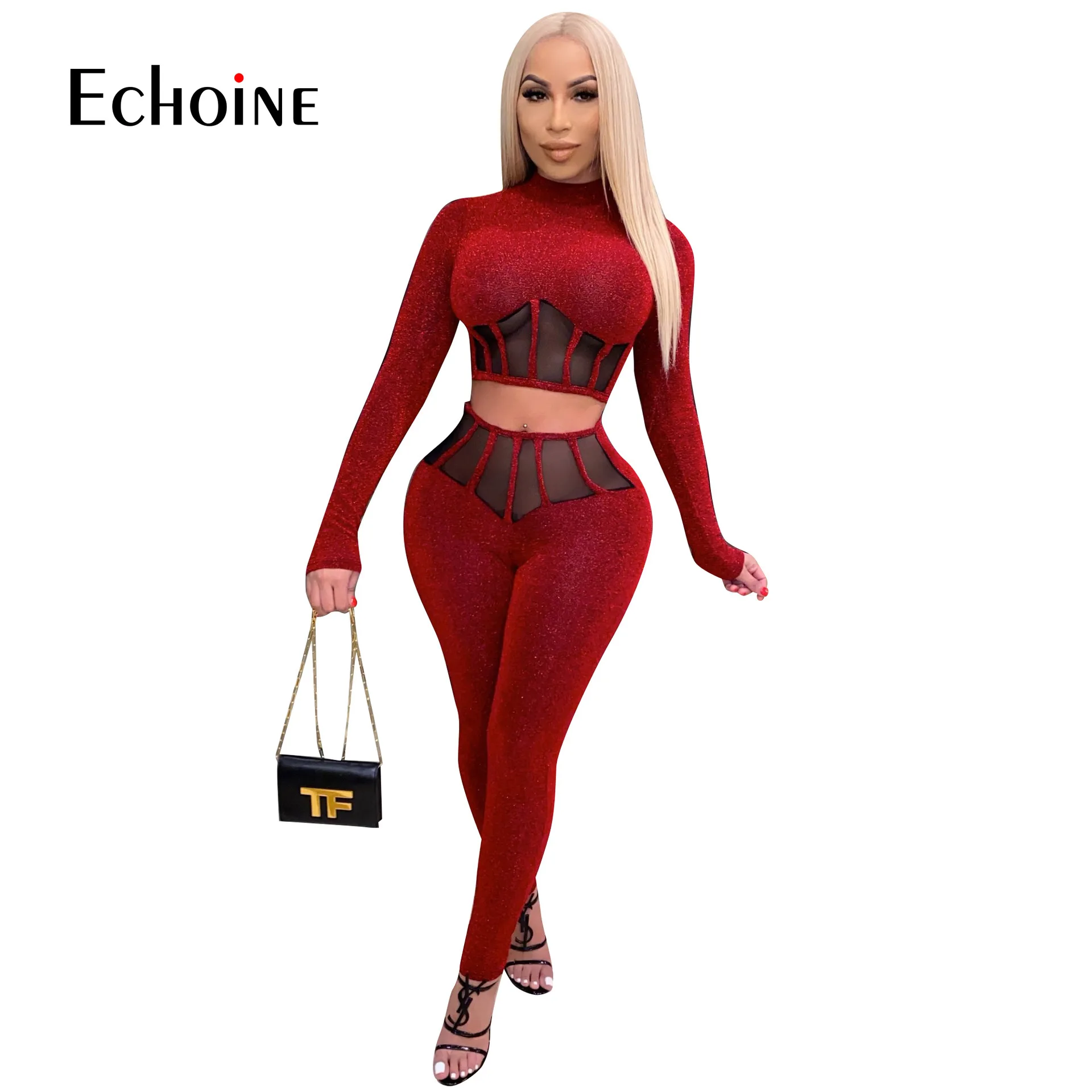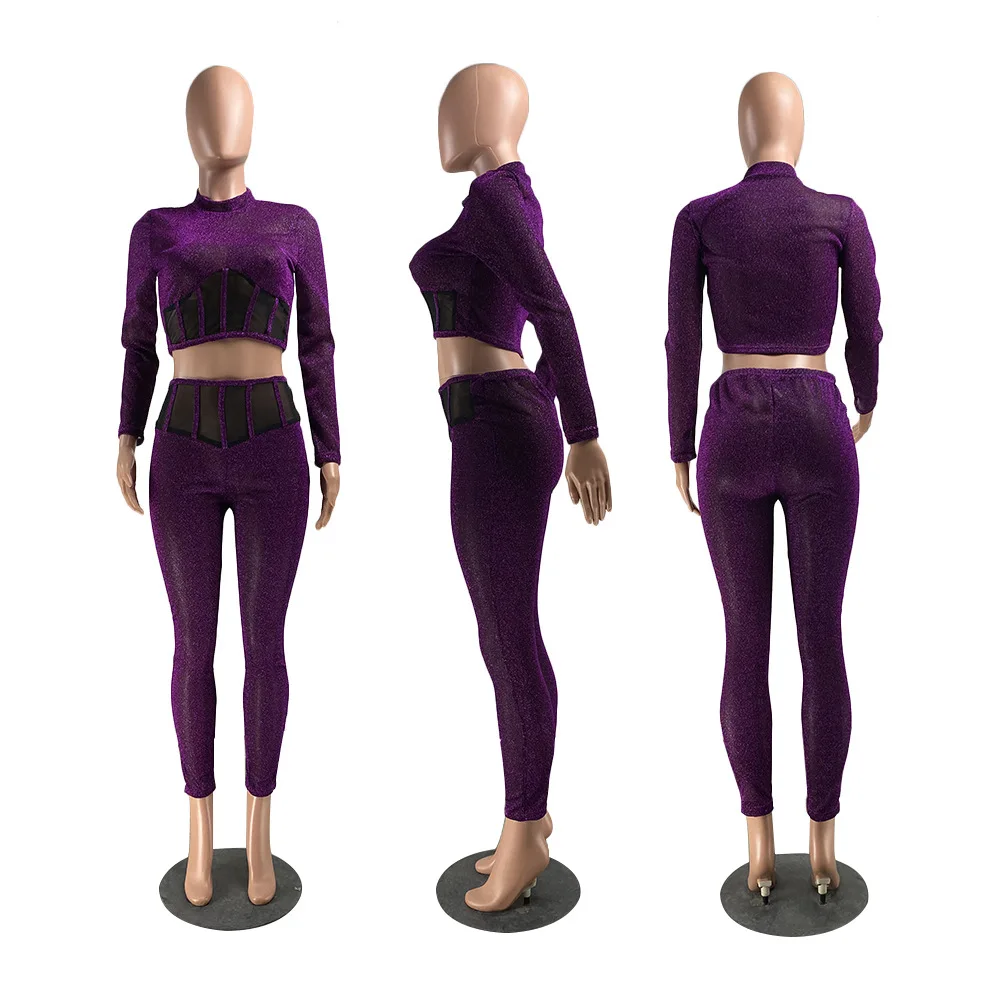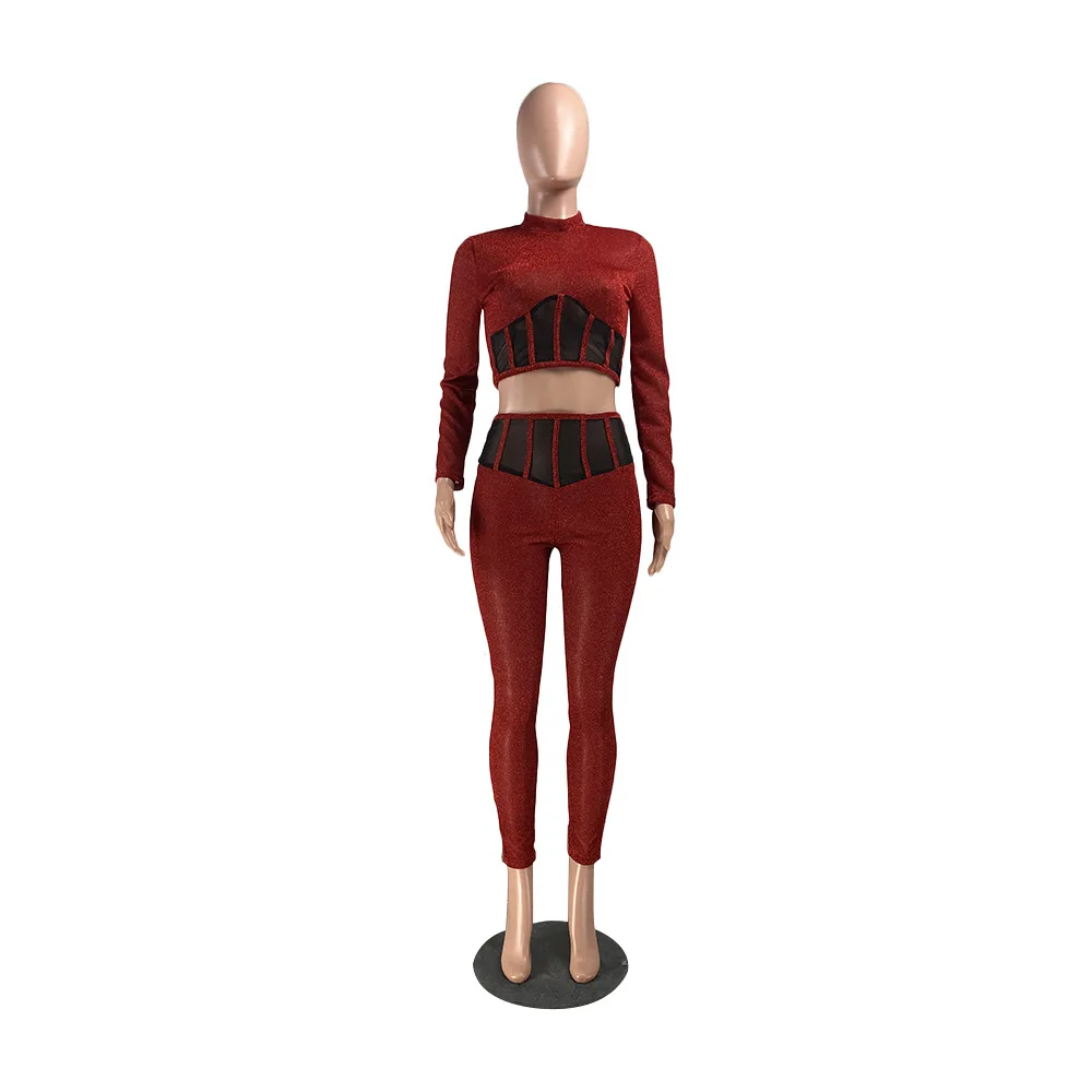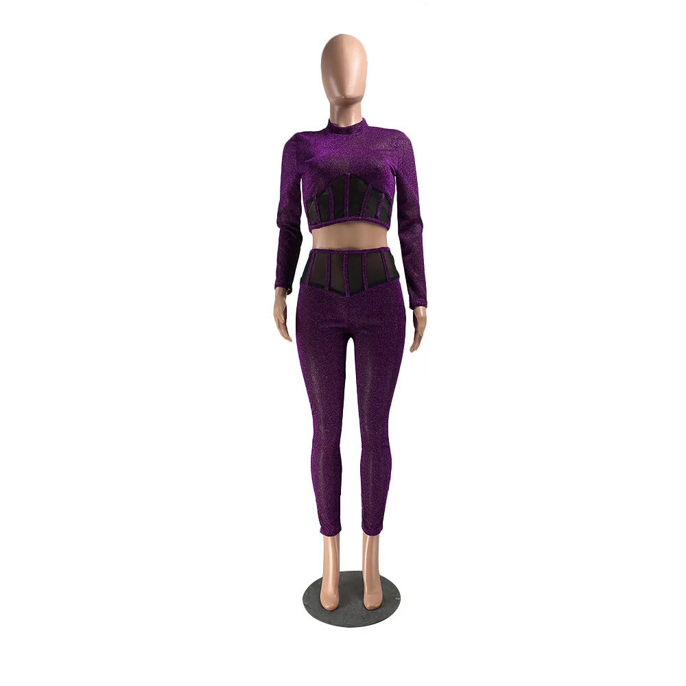 Женский сетчатый комплект из двух предметов, укороченный топ с длинными рукавами и обтягивающие брюки-карандаш