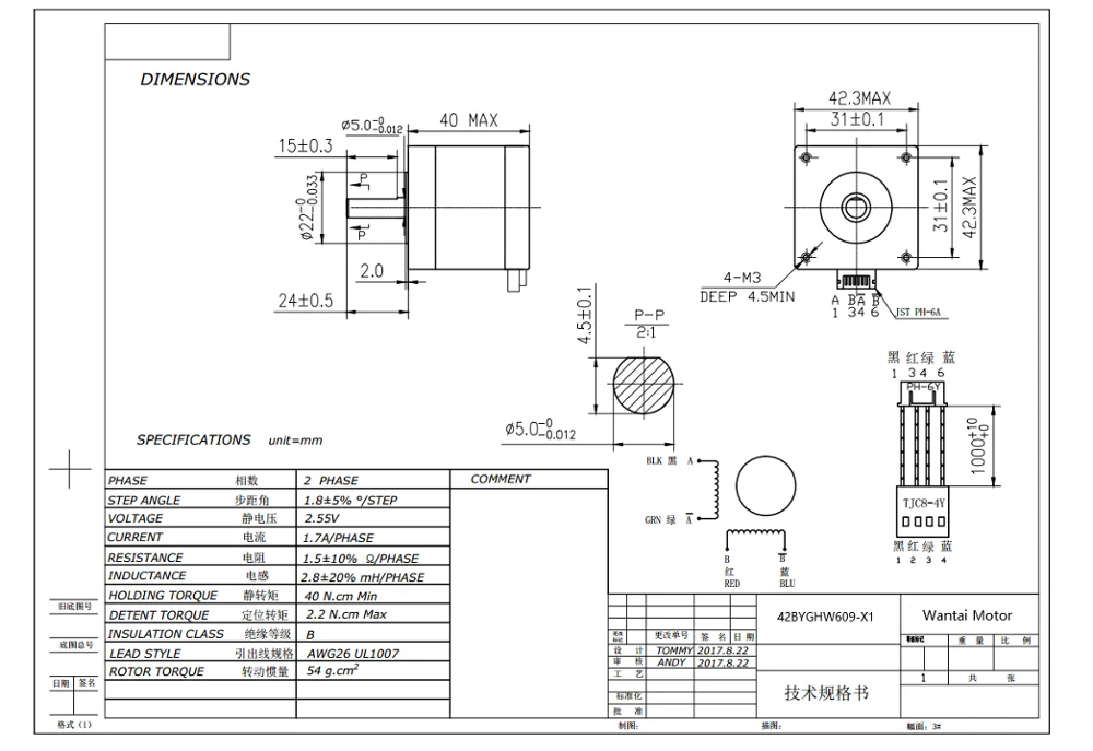 Доставка 5-7 дней, 5 шт., двигатель для 3D-принтера Nema17, 40 Н. См, 1,7 А, соединитель 1 м провод, 42BYGHW609-X1, шаговый двигатель Wantai