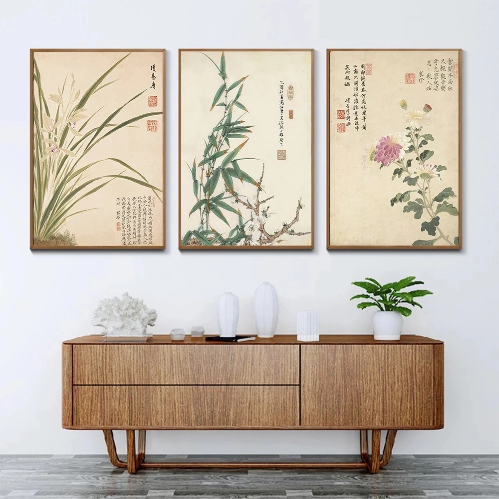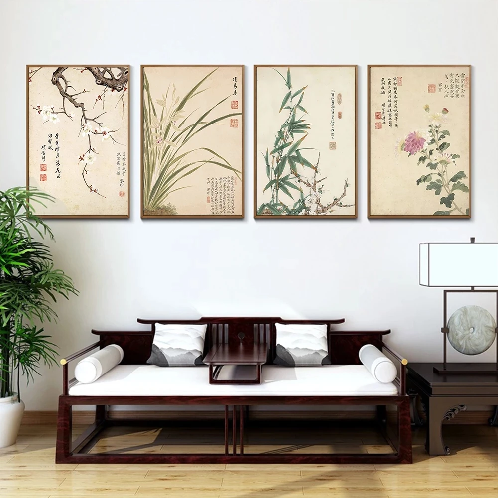 Художественный постер в китайском стиле с изображением растений, сливы, орхидеи, бамбука, хризантемы, классические картины на холсте, элегантное домашнее украшение для гостиной