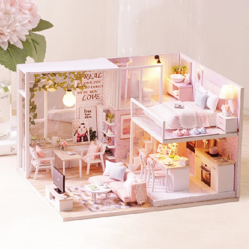 Музыкальная шкатулка, деревянная ручка сделай сам, Игрушечная модель, подарок для ребенка, Розовый светящийся дуплексный кукольный домик, музыкальная шкатулка, красивый декор для стола