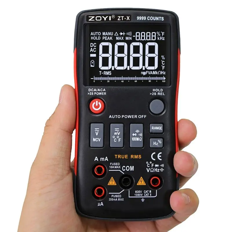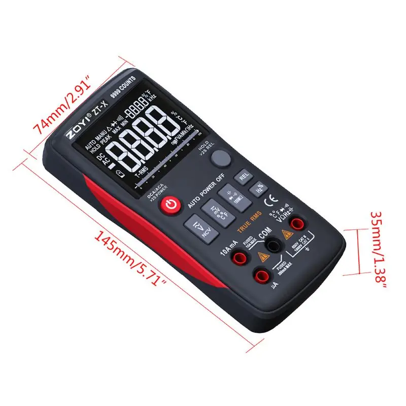 OOTDTYОсобенности:1. Автоматический/ручной диапазон2. Истинное эффективное измерение стоимости3. Кнопочное управление одной рукой4. Автоматическое распознавание текущего файла5. H-D дисплей6. Основной дисплей, вторичный дисплей, аналоговый бар три дисплея7,550 в Защита от высокого напряжения8. Измерение относительной стоимости9,9999 слов высокой точности дисплей10. Хранение данных, автоматическое отключение11. Измерение индукционного напряжения NCV12. Измерение частоты13. Измерение температуры14,12 функций (ключевой режим)Только дизайн кнопкиУдобная работа с одной рукойЖК-экран Larg с углом обзора 360 °Автоматический обмен на текущее тестирование при подключении тестовых проводовАнтиразрывная конструкция кронштейнаНапряжение (В), частота (Гц), аналоговый бар показывают одновременноИспытание температуры, Цельсия (°) и Фаренгейта (°) показывают одновременноЖК-дисплей с подсветкой, 9999 отсчетов Ture RMS автоматический мультиметр2.D-C/A-C & сопротивление & конденсатор & испытание частоты fucntion.Он включает Удержание данных, рабочий цикл, NCV, непрерывность и функцию тестирования диодов.Автоматическое отключение питания. Характеристики:Количество слов: 6000D-C напряжение: 1000 вA-C напряжение: 750 ВD-C ток: 9.999AA-C ток: 9.999AСопротивление: 99,99mΩЕмкость: 99.99mFЧастота: 9,999 МГцПримечания:1. Батарейки (2 шт. 1,5 V AA батареи) и в розницу box подберёт то не идут в комплекте с посылка.2. После включения мультиметра он находится в режиме V (D-C режиме напряжения), и если вы переключите его на режим A-C напряжения или режим мВ (A-C/D-C режим низкого напряжения), цифры на экране выбираются случайным образом, это из-за того, что мультиметр очень высок, поэтому это нормальное явление. Это не повлияет на точность измерений. Пожалуйста, не волнуйтесь.3. Допускается погрешность в 0-1 см из-за ручного измерения. Пожалуйста, убедитесь, что вы не возражаете, прежде чем сделать ставку.4. Из-за разницы между различными мониторами изображение может не отражать фактический цвет изделия. Спасибо!Посылка включает в себя:1xZT-X цифровой мультиметр1 х Измерительный Провод1 xтемпературный детектор1x Руководство пользователя