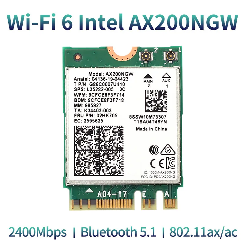 Особенности:Wi-Fi 6 м. 2 AX200 поддерживает 802.11ax MU-MIMO более 2,4 ГГц и 5 ГГц.Максимальная пропускная способность при поддержке Wi-Fi 6 AX200 является скорейшее 2,4 Гбит/с (160 МГц)AX200NGW поддерживает Bluetooth 5,1.AX200 может обеспечить гигабитную скорость загрузки и значительно улучшить ваш опыт подключения дома, работы или на ходу.Описание:Модель: Новый Wi-Fi 6 AX200 (AX200NGW);Интерфейс: M.2 NGFF, не совместим с M.2:CNVI;Двухдиапазонный: 2,4 ГГц/5 ГГц (160 МГц);Скорость до 2400 Мбит/с (маршрутизатор должен быть на 160 МГц)(802.11ax);Поддержка Bluetooth 5,1;Поддержка MU-MIMO;Поддержка Windows 10 64bit, Linux;Примечание: не поддерживает Windows 7/8/8.1.Совместимость с:Он может использоваться на Samsung/Dell/Sony/ACER/ISUS/MSI/Clevo/Terransforce/Hasee и т. Д.Не поддерживает Ноутбук IBM/Thinkpad/lenovo/hp. (но для ноутбука HP/Lenovo 2016 выше, он может поддерживать.)