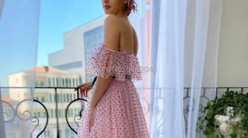 Лори Винтаж платье для выпускного вечера с открытыми плечами с черным пояском с узором в горошек розового цвета Чай Длина вечерние платья с карманами как у знаменитостей, ночное платье