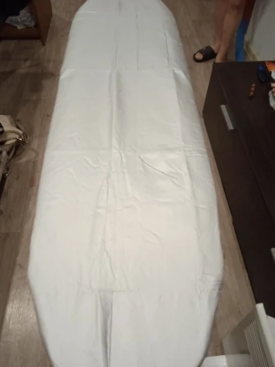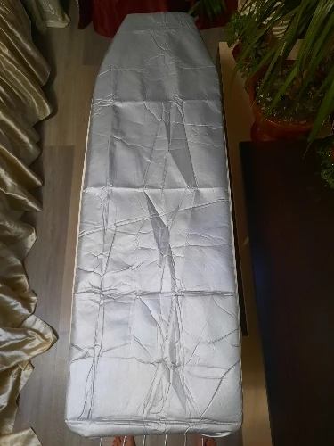 Не повторяйте мою ошибку - чехол надо брать БОЛЬШЕ вымеряного размера, потому что иначе вы сможете только накрыть доску, о том чтобы заправить покрытие и затянуть его даже не думайте - не получится. У меня доска 130х28 - такое покрытие я и заказала именно такой размер и прибыл. Ес-но никак его не натянуть!