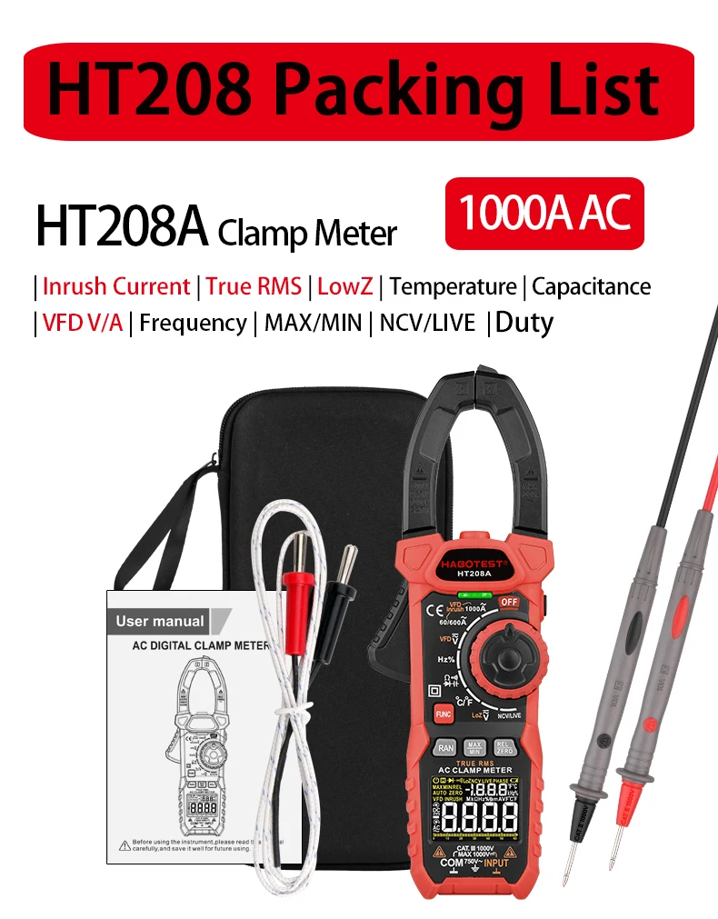 Токоизмерительный амперометрический хомут HABOTEST Профессиональный цифровой мультиметр 1000 В 1000А VFD NCV тестер напряжения HT208 серия
