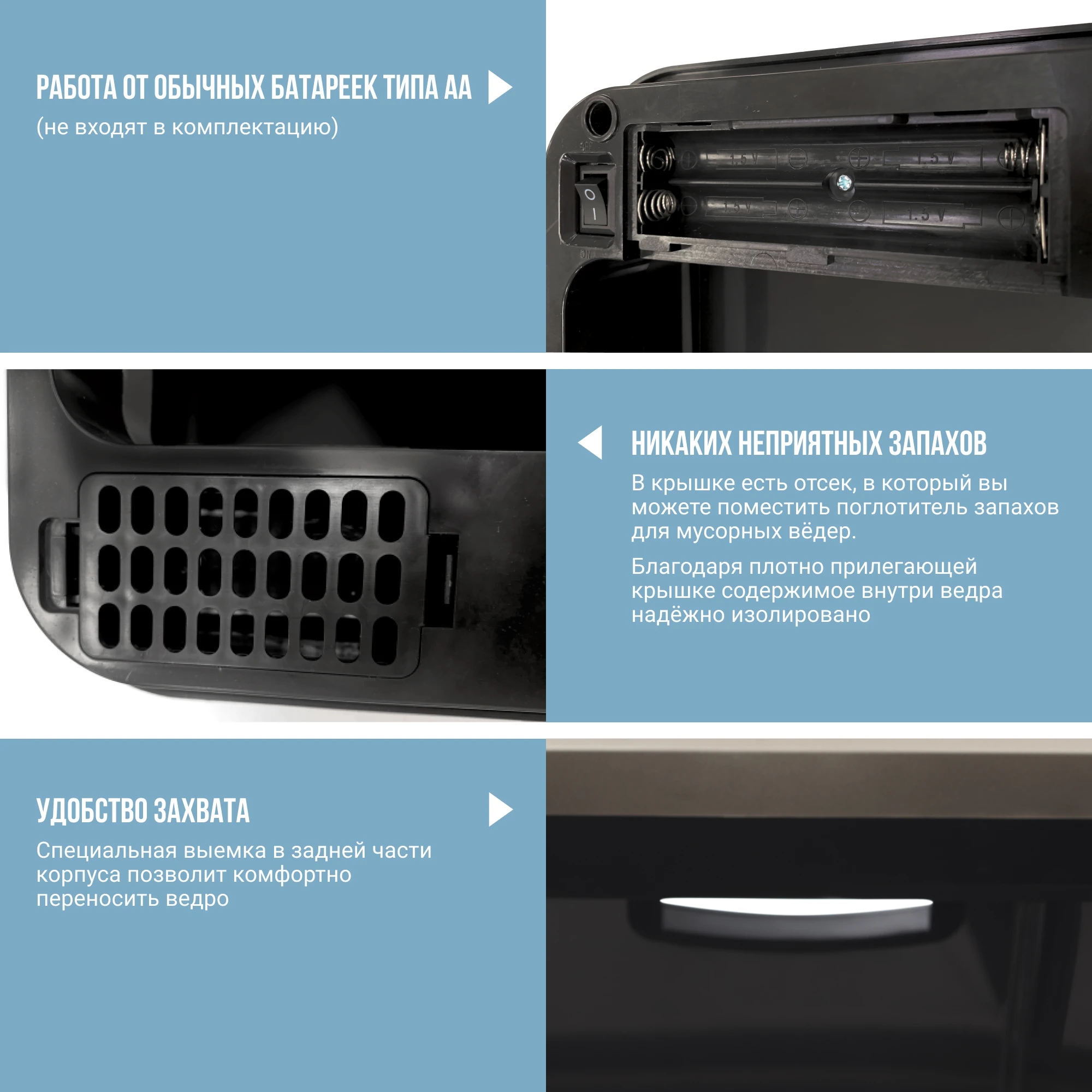 Несколько режимов работы, в том числе ручной, который позволяет управлять открытием и закрытием крышки контейнера с помощью сенсорных кнопок, расположенных на фронтальной панели ведра.