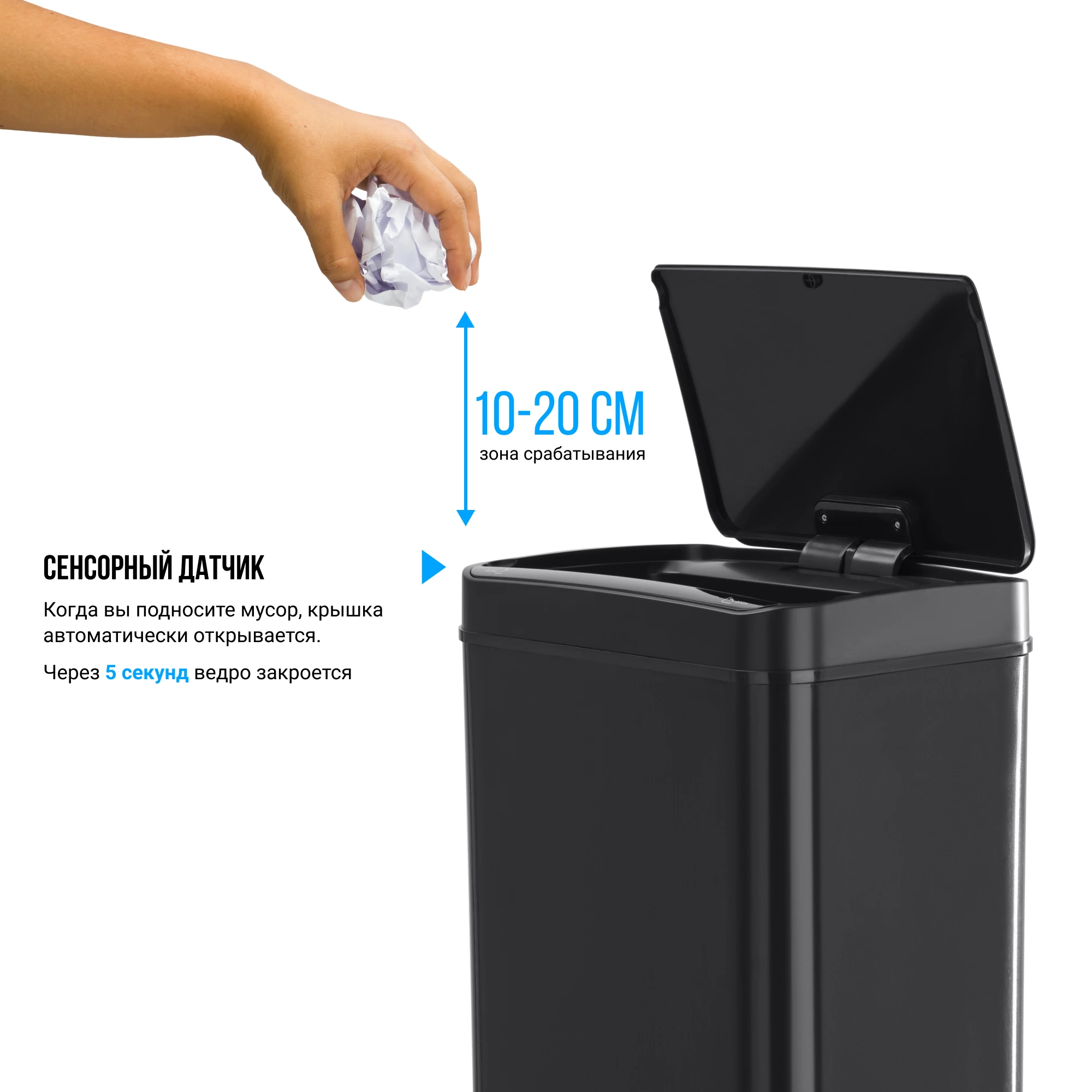 Опустите мусор в контейнер и затем уберите руки из зоны срабатывания сенсорного датчика, который даст команду на закрытие крышки через 5 секунд.
