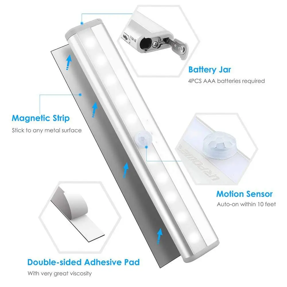 Светильник с пассивным инфракрасным датчиком движения для шкафа, питание от батарейки, настенный светильник для шкафа, гардероба, лестницы, кухни, 10 светодиодов