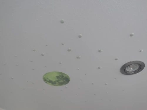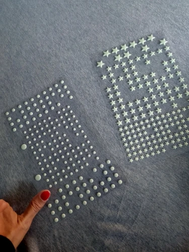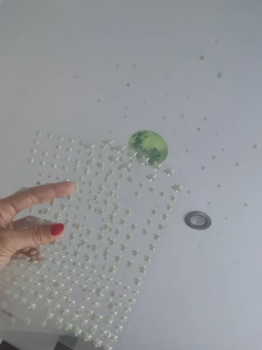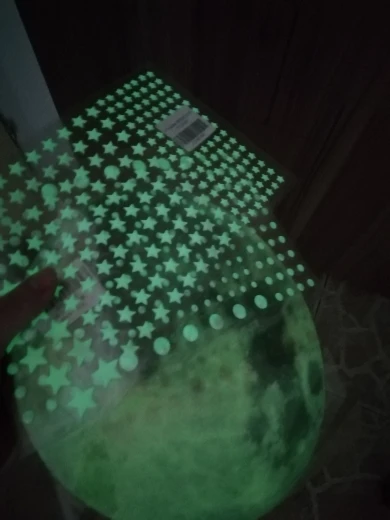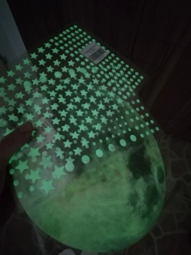 Товар пришел согласно времени доставки.Луна как настоящая. Количество звёзд хватило обклеить всю комнату. Красиво ночью. Минус- большие звёзды слабо клеются...наклейки есть наклейки