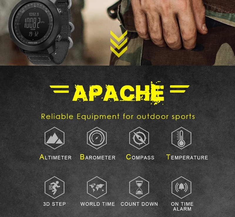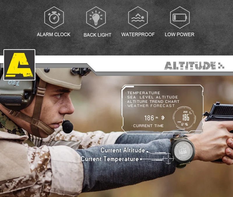 1, высотомер (высота тренда и скорость подъема) 2, барометр (диаграмма тренда давления воздуха) 3, компас 4, термометр 5, прогноз погоды 6, шагомер, счетчик шагов, калории, запись расстояния 7. Функции времени: час, минута, секунда, год (2000-2099), месяц, дата, будний день, 8, будильник (2 комплекта будильника,) 9, таймер обратного отсчета (99:59:59 ~ 0) 10, Секундомер (0 ~:59:59), 12, функции времени в мире (автоматическое переключение времени в летнее время) 13, корпоративный цифровой компас, высотомер, барометр, термометр, тренд давления воздуха и тренд высоты 14, кнопка включения или выключения 15, срок службы батареи 16, подсветка EL