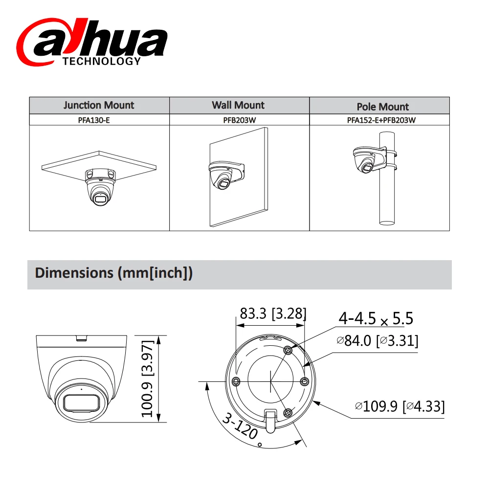 Model: IPC-HDW2431T-AS-S21.Camera: Image Sensor: 1/3” 4Megapixel progressive CMOSEffective Pixels: 2688 (H) × 1520 (V)ROM: 128 MBRAM: 128 MBScanning System: ProgressiveElectronic Shutter Speed: Auto/Manual 1/3 s–1/100000 sMin. Illumination: 0.008 Lux @ F1.6IR Distance: 30 m (98.43 ft)IR On/Off Control: Auto/ManualIR LEDs Number: 2Pan/Tilt/Rotation Range: Horizonal: 0°–360°Vertical: 0°–78°Rotation: 0°–360°2.Lens: Lens Type: FixedMount Type: M12Focal Length: 2.8 mm3.6 mmMax. Aperture: F1.6F1.6Field of View: 2.8 mm:Horizonal: 102.0°Vertical: 55.0°Diagonal: 121.0°3.6 mm:Horizonal: 84.0°Vertical: 45.0°Diagonal: 100.0°Iris Type: Fixed apertureClose Focus Distance: 2.8 mm: 0.9 m (2.95 ft)3.6 mm: 1.6 m (3.61 ft)3.Smart event: General IVS Analytics: Intrusion; tripwire4.Video: Video Compression: H.265; H.264; H.264B; MJPEGSmart Codec: YesVideo Frame Rate: Main stream:2688 × 1520 (1 fps-20 fps)2560 × 1440 (1 fps-25/30 fps)Sub stream:704 × 576 (1 fps-25 fps)704 × 480 (1 fps-30 fps)Stream Capability: 2 streamsResolution: 2688 × 1520 (2688 × 1520); 2560 × 1440 (2560 × 1440); 2304 × 1296 (2304 × 1296); 1080p (1920 × 1080); 1.3M (1280 × 960); 720p (1280 × 720); D1 (704 × 576/704 × 480); VGA (640 ×480); CIF (352 × 288/352 × 240)Bit Rate Control: CBR/VBRVideo Bit Rate: H.264: 32 Kbps–6144 KbpsH.265: 12 Kbps–6144 KbpsDay/Night: Auto(ICR)/Color/B/WBLC: YesHLC: YesWDR: 120 dBWhite Balance: Auto/natural/street lamp/outdoor/manual/regional customGain Control: Auto/ManualNoise Reduction: 3D DNRMotion Detection: OFF/ON (4 areas, rectangular)Region of Interest(RoI): Yes (4 areas)Smart IR: YesImage Rotation: 0°/90°/180°/270° (Supports 90°/270° with 1080p resolution.)Mirror: YesPrivacy Masking: 4 areas5.Audio: Built-in MIC: YesAudio Compression: G.711A; G.711Mu; G.726; AAC6.Network: Network: RJ-45 (10/100 Base-T)Protocol: IPv4; IPv6; HTTP; HTTPS; TCP; UDP; ARP; RTP ; RTSP; RTCP; RTMP; SMTP; FTP; SFTP; DHCP; DNS; DDNS; QoS; UPnP; NTP; Multicast; ICMP; IGMP; NFS; PPPoE; 802.1x; BonjourInteroperability: ONVIF(Profile S/Profile G);CGI;P2P;Milestone;GenetecUser/Host: 20Edge Storage: Cloud; FTP; SFTP; Micro SD Card (support max. 256 GB); NASBrowser: IEChromeFirefoxManagement Software: Smart PSS; DSS; DMSSMobile Phone: IOS; Android7.Certification: Certifications: CE-LVD: EN60950-1CE-EMC: Electromagnetic Compatibility Directive 2014/30/EUFCC: 47 CFR FCC Part 15, Subpart BUL/CUL: UL60950-1 CAN/CSA C22.2 No.60950-1-078.Power: Power Supply: 12V DC/PoE (802.3af)Power Consumption: < 6.6W9.Environment: Operating Conditions: -40°C to +60°C (-40°F to +140°F)/less than ≤ 95%Storage Temperature: -40°C to +60°C (-40°F to +140°F)Protection: IP6710.Structure: Casing: Metal + PlasticDimensions: 100.9 mm × Φ109.9 mm (3.97" × Φ4.33")Net Weight: 0.39 kg (0.9 lb)Gross Weight: 0.56 kg (1.2 lb)