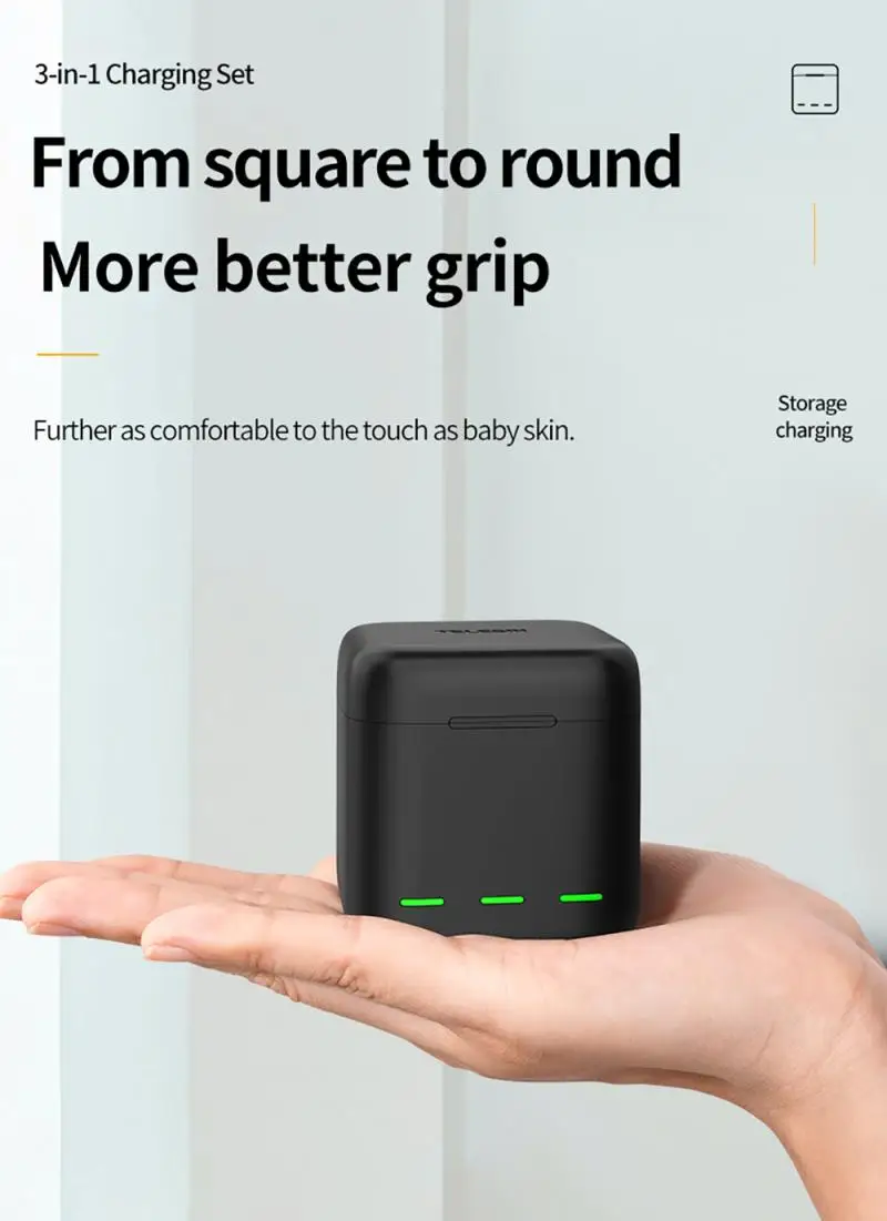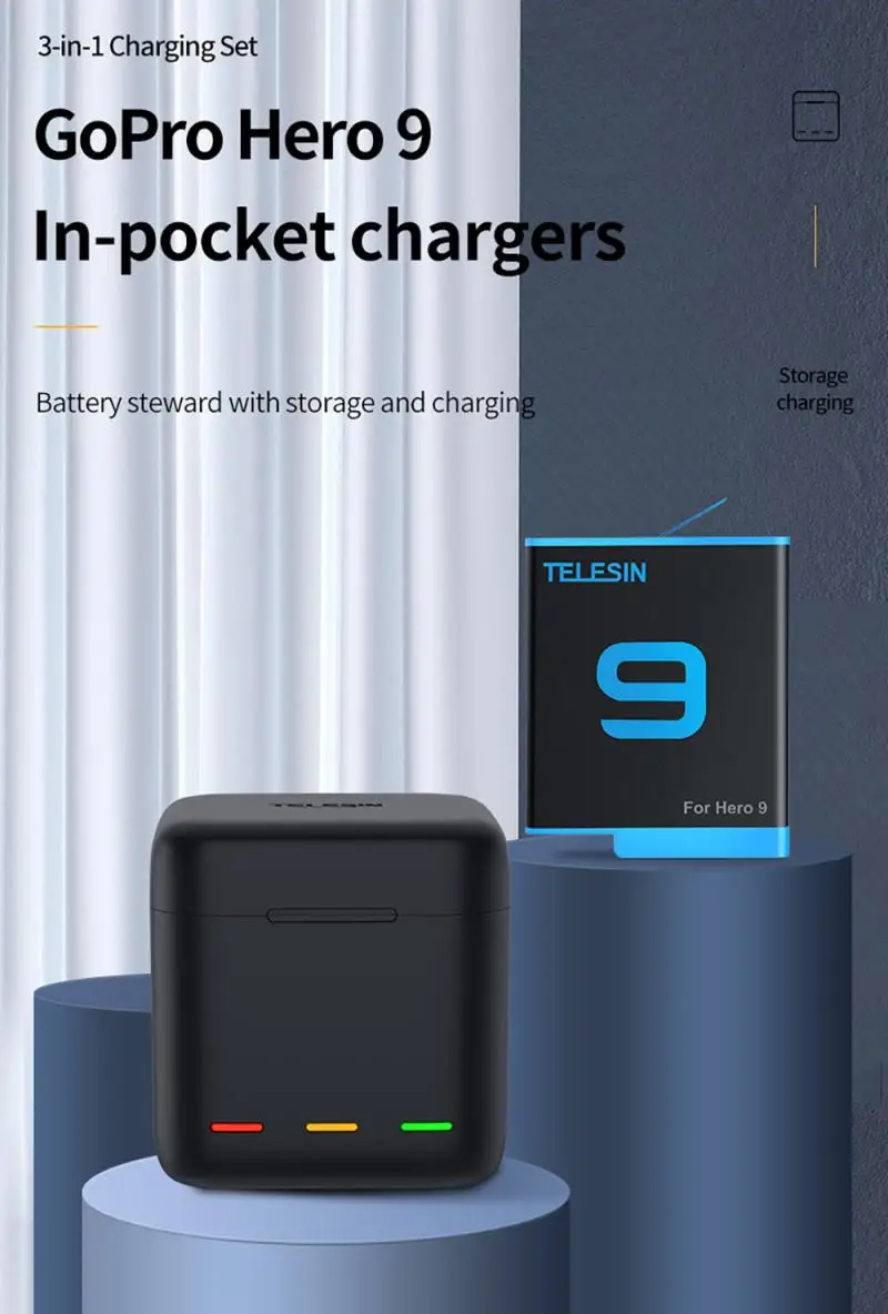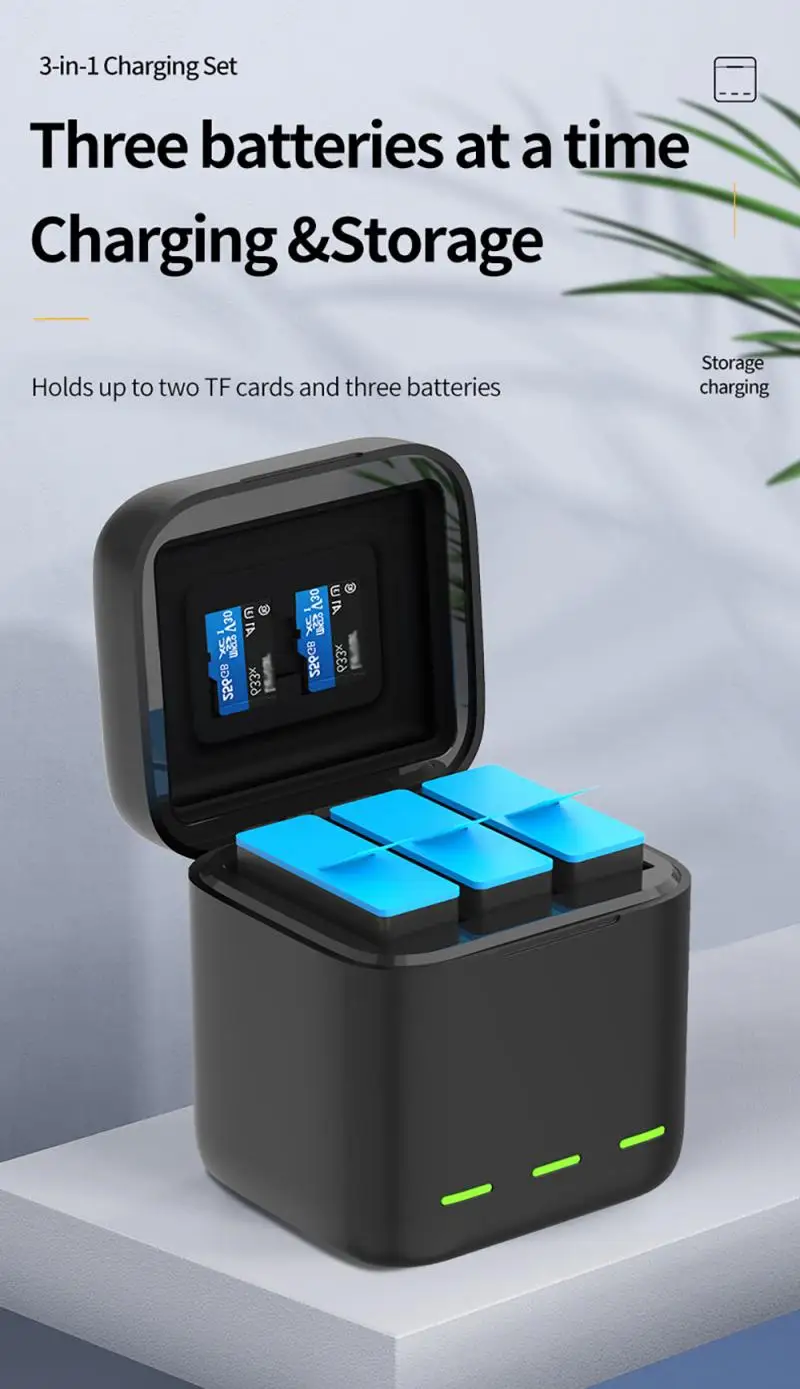 3-канальный мини USB зарядное устройство для GoPro Hero 9 черного цвета, может одновременно заряжать до 3 батарей, также предназначен как ящик для хранения ваших батарей.