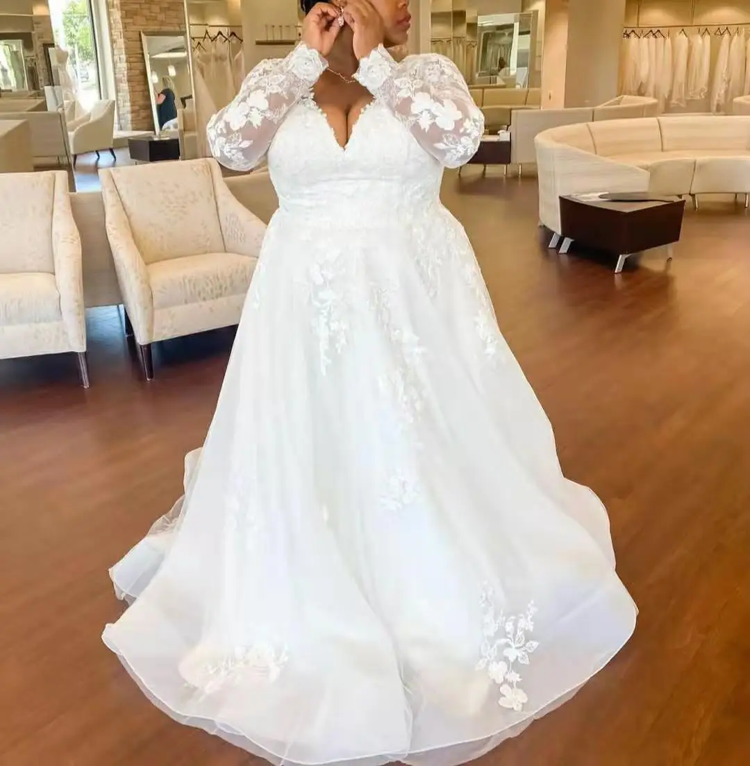 Длинные свадебные платья трапециевидной формы с v-образным вырезом размера плюс, кружевные свадебные платья с рукавами на заказ, цвета слоновой кости, тюль, длина до пола, корсет, сзади, свадебные платья для женщин