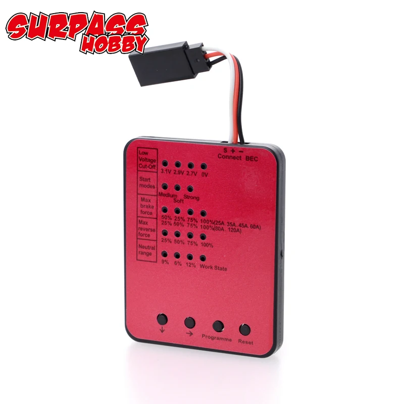 Особенности: Светильник вес Простота в использовании Портативный дизайн Специально разработан для бесщеточного ESC selled в нашем магазине Характеристики: Бренд: SURPASS HOBBY Низкое напряжение отрезать: 3,1 V/Cell 2,8 V/Cell 3,3 V/Cell без отрезной Режим запуска: средний, мягкий, прочный Максимальная Тормозная сила: 25%, 50%, 75%, 100% Максимальная обратная сила: 25%, 50%, 75%, 100% Нейтральный диапазон: 6%, 9%, 12%, рабочее состояние Информация о посылка: Посылка Размер: 8*6,5*5 см/3,1*2,5 * 2in Посылка Вес: 38 г/1,3 унций Фирменная подарочная коробка посылка