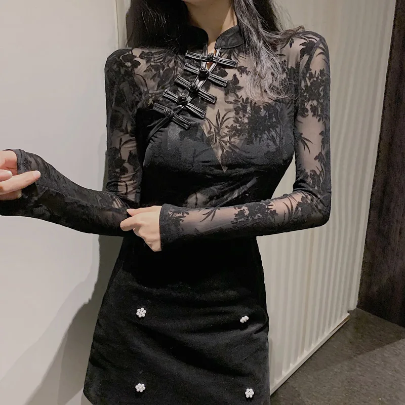 Блузка женская кружевная прозрачная в китайском стиле, винтажная блузка с высоким воротником и длинным рукавом, рубашка, Топ