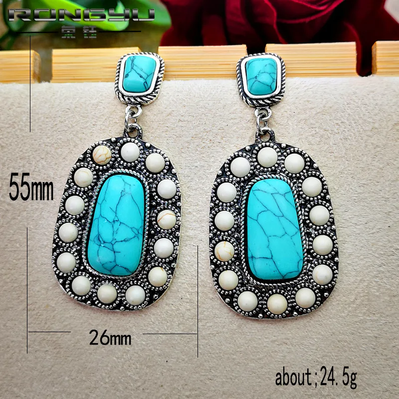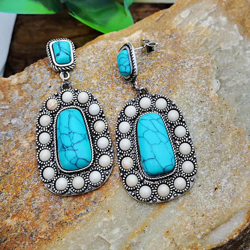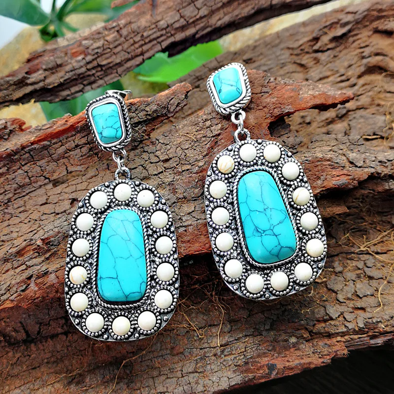 Богемные этнические Стиль натуральный голубой бирюзовый камень Висячие серьги для женщин в винтажном стиле, сапоги в панковском стиле, белые бусы серьги-подвески ювелирных изделий Индии