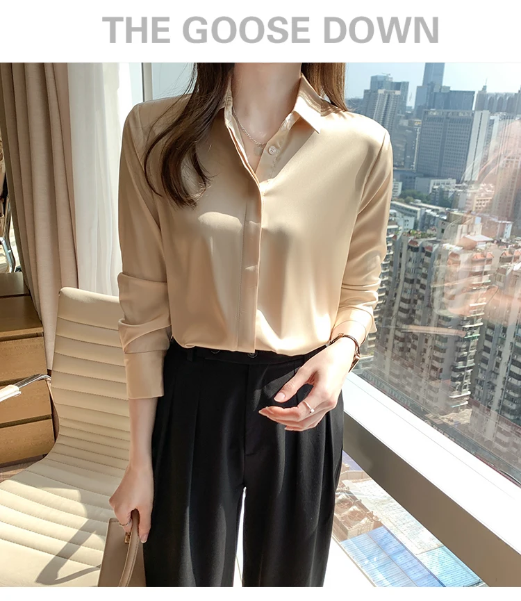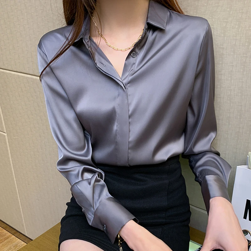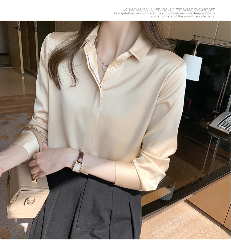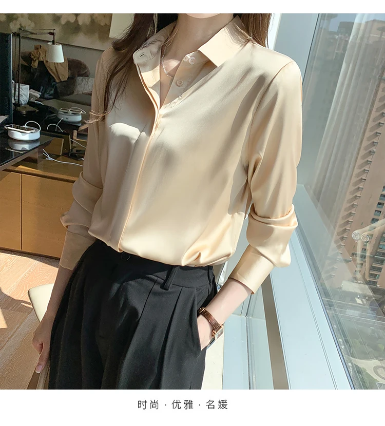 Женская атласная рубашка с отложным воротником, Повседневная шифоновая блузка с длинным рукавом, свободная однотонная, для весны, 12803