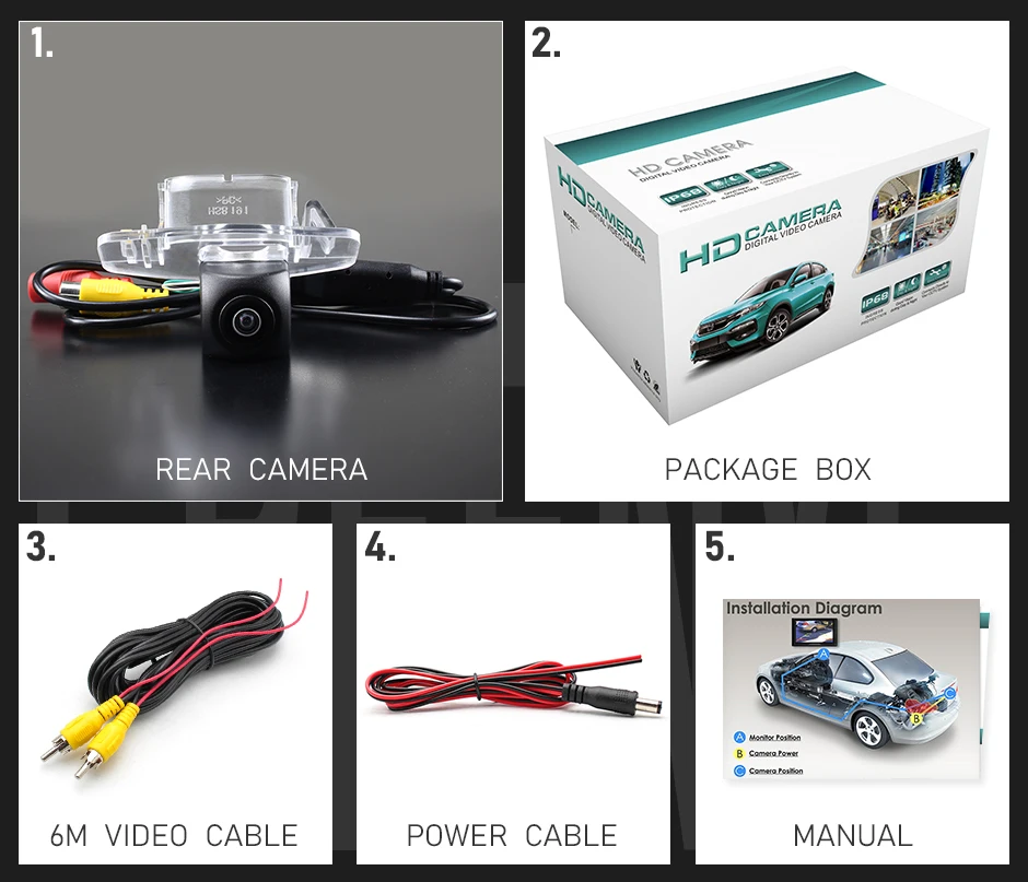 1. Задняя камера2. Коробка для посылка3. Видео кабель (6 м)4. Кабель питания5. Руководство пользователя