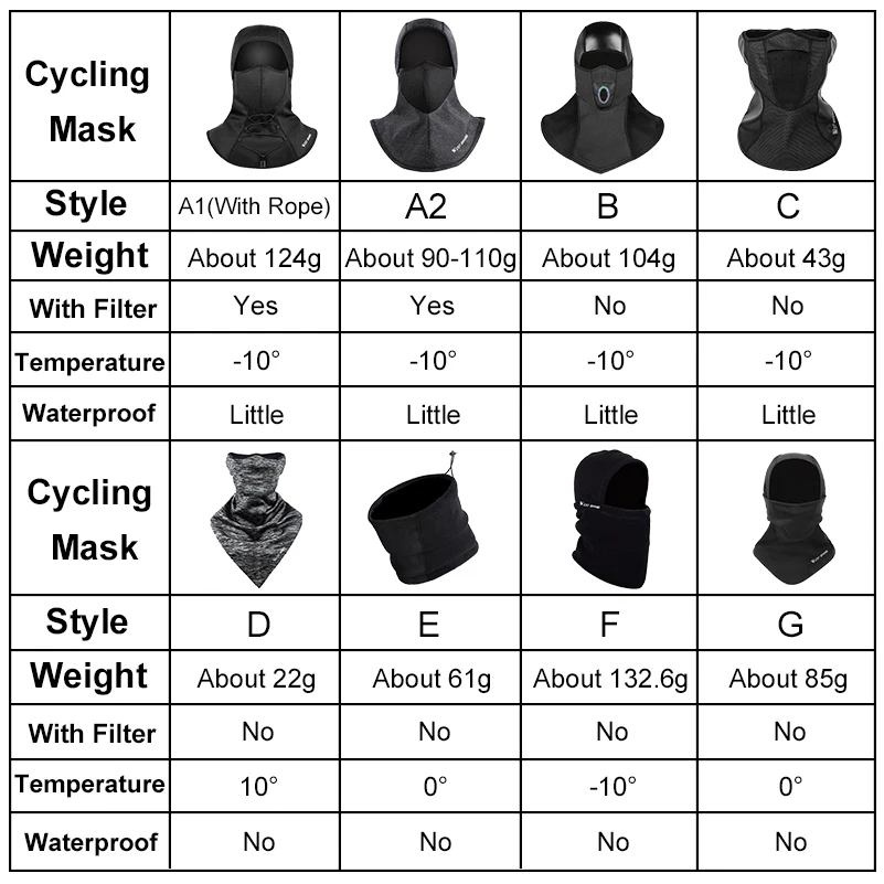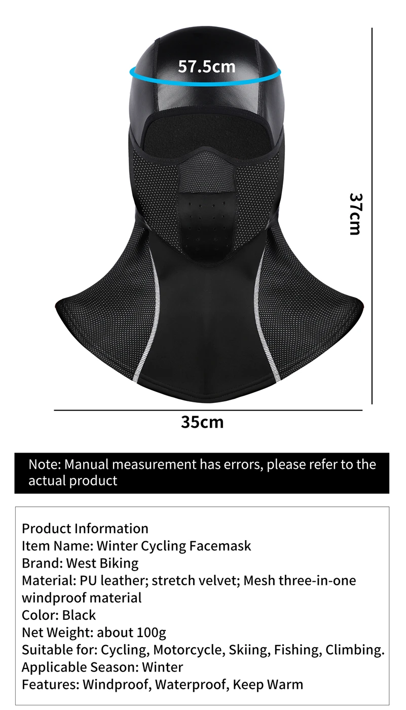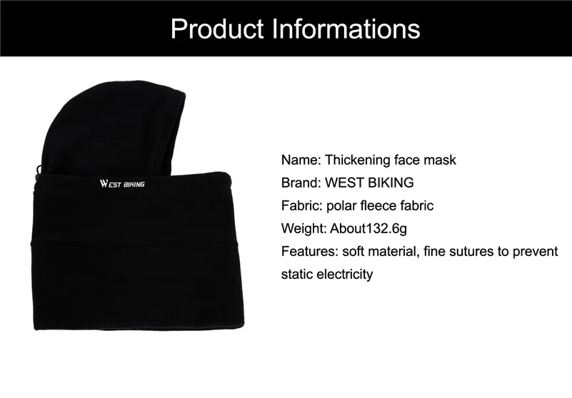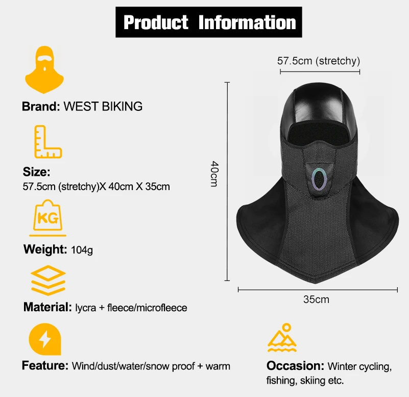 Вес: 104 гМатериал: лайкра + флис/микрофлисХарактеристики: защита от ветра/пыли/воды/снега + теплоПовод: зимняя езда на велосипеде, рыбалка, катание на лыжах и т. д.