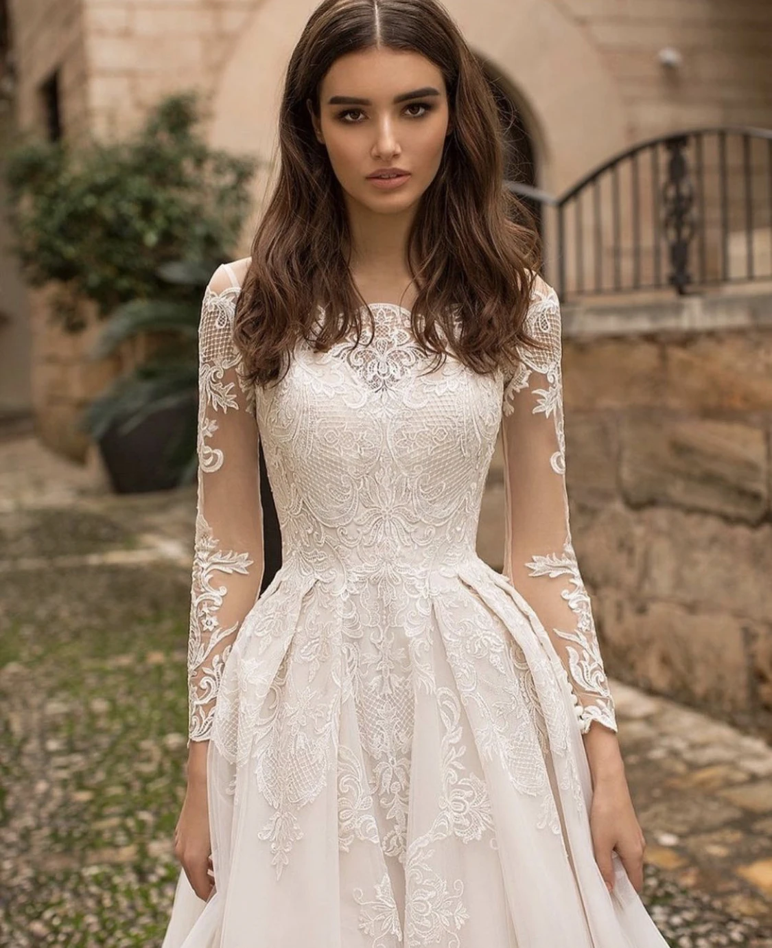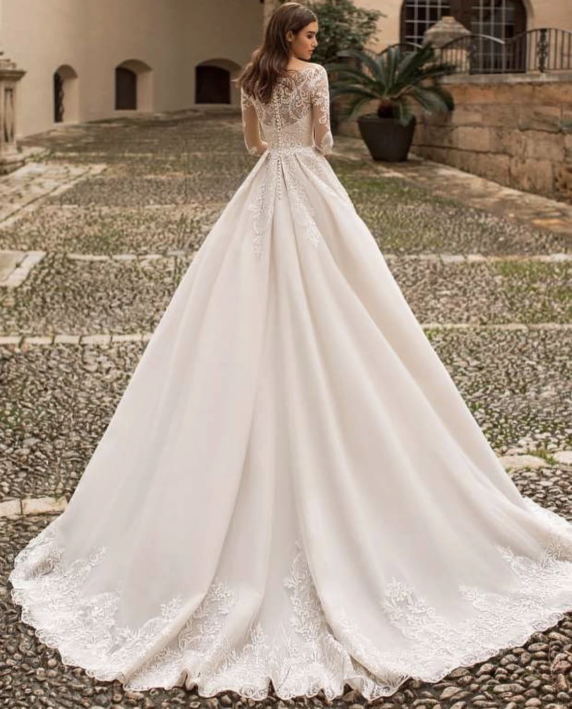 Великолепное свадебное платье принцессы 2021, ТРАПЕЦИЕВИДНОЕ винтажное платье невесты с кружевной аппликацией и шлейфом на пуговицах и длинным рукавом