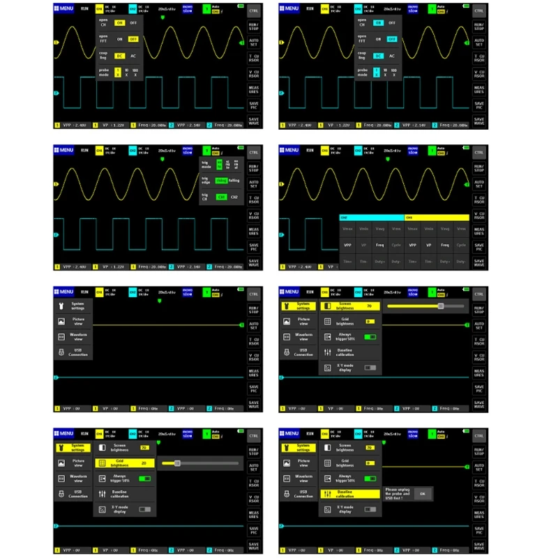 Спецификация:Ширина аналогового ремешка: 100 МГц * 2Количество каналов: 2 каналаМаксимальная частота дискретизации в реальном времени: 1GSa/sВертикальная чувствительность: 50 мВ/див ~ 500 В/ДивГоризонтальный диапазон времени: 50S/div ~ 10NS/divМаксимальное тестовое напряжение: 40 В (1X зонд), 400 В (10X зонд)Глубина хранения: 240 кбитВходное сопротивление: 1 мТочность ADC: 8 битРежим соединения: AC/DCРежим запуска: одиночный, нормальный, автоматическийКромка триггера: поднимающаяся кромка/опускающаяся кромкаВнешнее триггерное напряжение 0 - 40 вДисплей: 7 дюймов-800*480Работа: емкостный сенсорный экран + жестыУдлинительные порты: экспорт изображений USBИсточник питания: литиевая батарея 6000 мАчРазмер: 184 мм x 124 мм x 50 ммОбщий вес: 650 гКоличество: 1 комплект