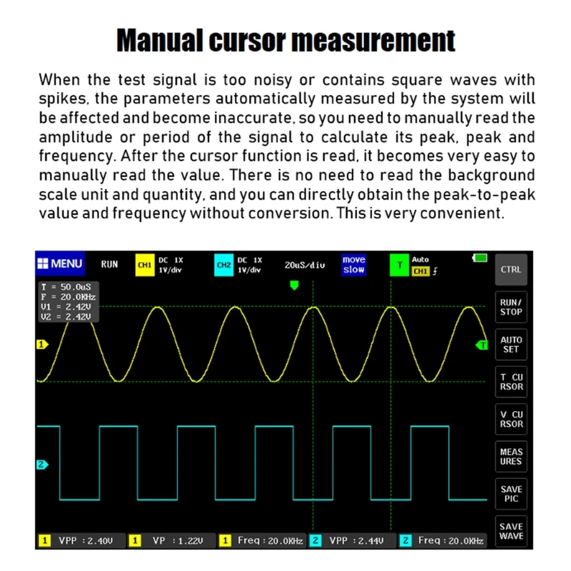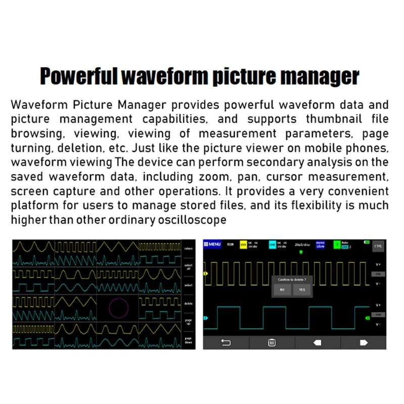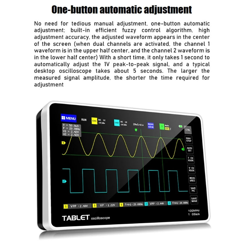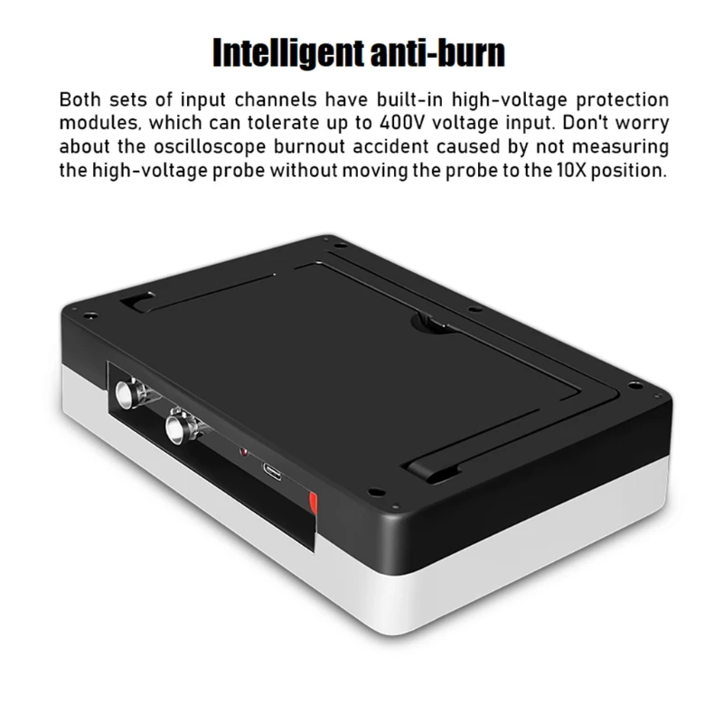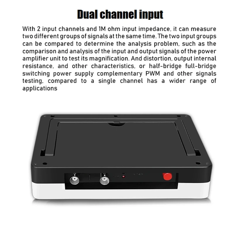 Особенности:1: интеллектуальная защита от ожогов, 1X Выдерживает напряжение до 400 В2: аналоговая полоса пропускания 100 МГц @ частота дискретизации 1GSa/s (1X = 5 МГц, 10X = 100 МГц)3: полностью подходит для 7 дюймов 800*480 цветной TFT ЖК-дисплей с яркими цветами и высокой контрастностью4: емкостный сенсорный экран, такой же, как и Сенсорный режим современного мобильного ipad-это не резистивный сенсорный экран с древней операцией ногтей5: Диапазон высокого напряжения, 1x может измерить 0 ~ 40 В, 10x может измерить 0 ~ 400 В, 100x может измерить 0 ~ 4000 в6: до 12 параметров измерения: VPP,VP,Vmax,Vmin,Vavg,Vrms, частые, Duty +,Duty-,Time +,Time-,Period7: Функция измерения курсора, удобно вручную измерять период, частоту и напряжение8: Полная функция запуска (одиночный, нормальный, автоматический)9: в любое время дисплей формы волны (Функция паузы) Заморожен-10: Оснащен высокой эффективностью одной кнопкой авто11: одна кнопка хранения сигналов и скриншот12: встроенный объем памяти 1 Гб, может хранить до 1000 скриншотов + 1000 наборов данных волноводной формы13: Мощный Графический менеджер поддерживает просмотр, просмотр, Детальный просмотр, поворот страницы, удаление и масштабирование формы волны, масштабирование, перемещение и т. Д.14: оснащен интерфейсом USB, который может быть подключен к компьютеру, чтобы поделиться своими скриншотами с компьютером, что удобно для вторичного анализа15: функция графического дисплея Lissajous может использоваться для определения амплитуды, частоты и фазового контраста двух групп сигналов16: функция отображения FFT, может анализировать Спектральные характеристики сигнала17: Встроенная перезаряжаемая литиевая батарея 6000 мАч, полностью заряжается в течение 4 часов непрерывного использования при максимальной яркости экрана18: технология сжатия памяти, экран обновления формы волны не мерцает19: Регулировка яркости экрана20: Регулировка яркости фоновой сетки21: ультратонкий, легко носить с собой