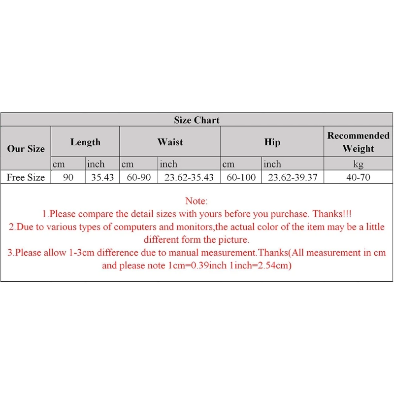 Размер: один размер Длина: 90 см (35,43 дюйма) Талия: 60-90 см (23,62 дюйма-35,43 дюйма) бедра: 60-100 см (23,62 дюйма-39,37 дюйма) рекомендуемый вес: 40-70 кг