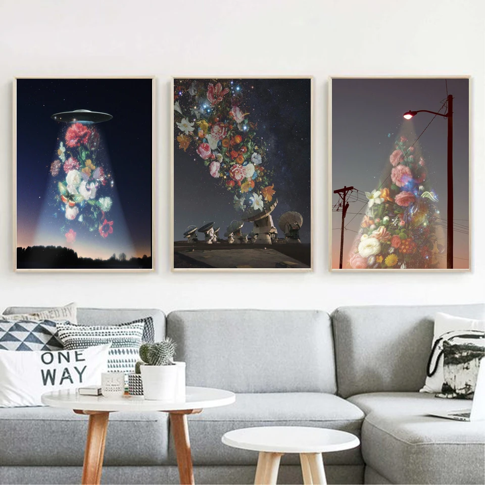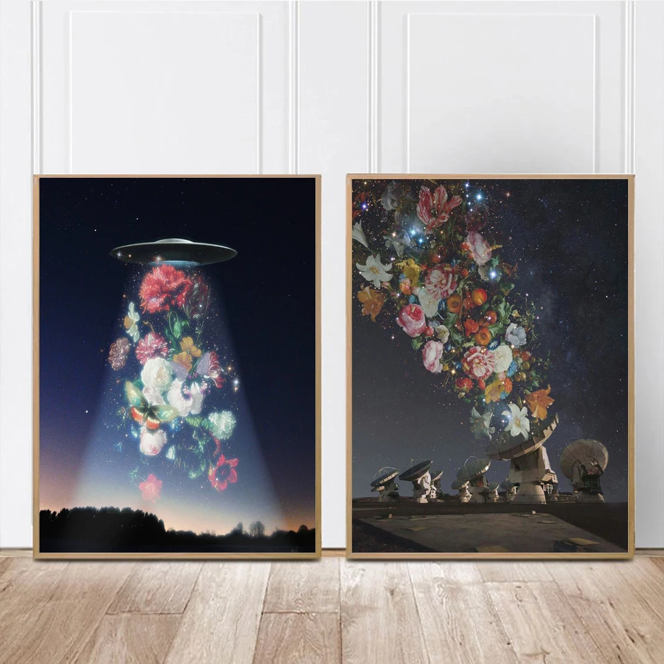 Картина на холсте, плакаты, сюрреалистичная ретро Цветочная девушка в звездном небе, Настенная картина для гостиной, украшение для дома