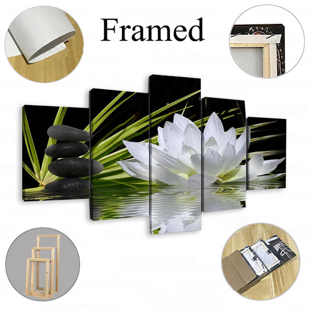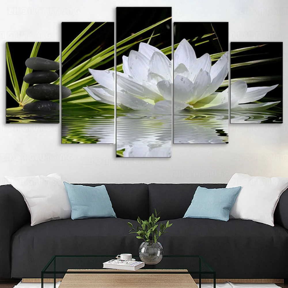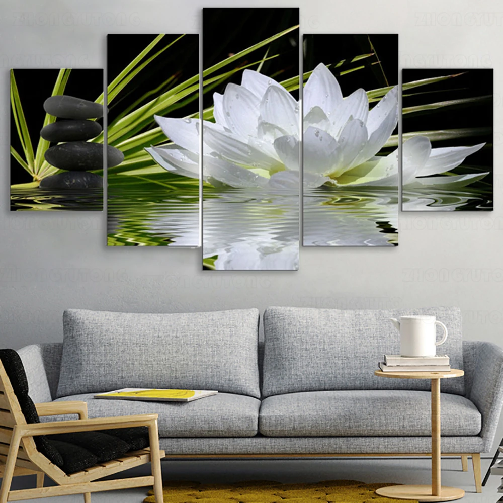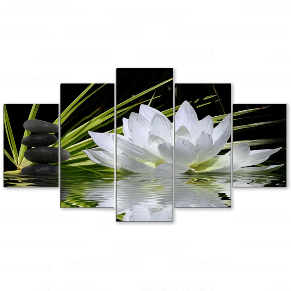 Современное домашнее художественное украшение для стен модульные картины 5 шт. Белый Лотос цветок водяной булыжник HD напечатанные на холсте картины