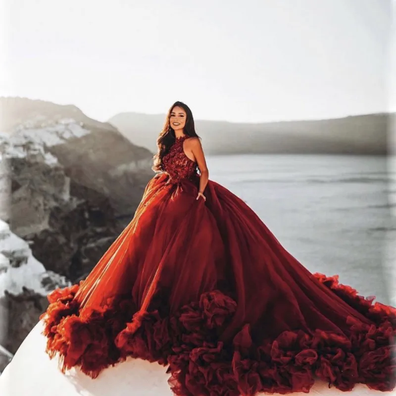 Темно-красное Пышное Тюлевое платье для выпускного вечера с кружевным верхом без рукавов с оборками вечернее платье со шлейфом для Саудовской Аравии вечернее платье на заказ