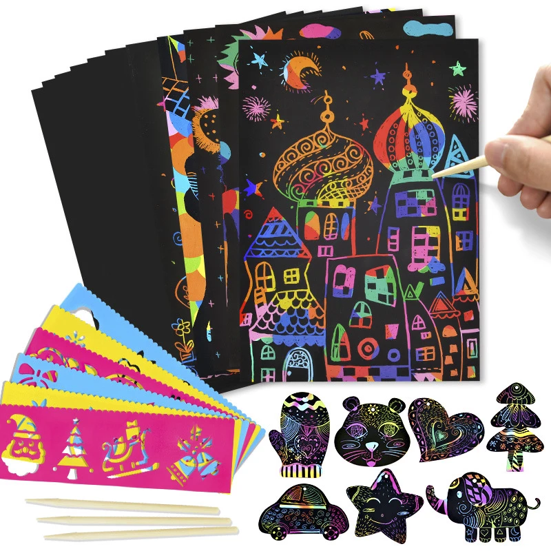 Волшебная Радужная цветная бумага для скретч арта набор карт с трафарет для граффити доска для рисования палка DIY художественная живопись развивающие игрушки подарок